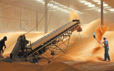 許昌市建安區(qū)陳曹鄉(xiāng)雙廟村金豐公社農(nóng)業(yè)服務(wù)有限公司,工作人員在糧倉(cāng)中整理剛剛?cè)霂?kù)的小麥。資料圖片