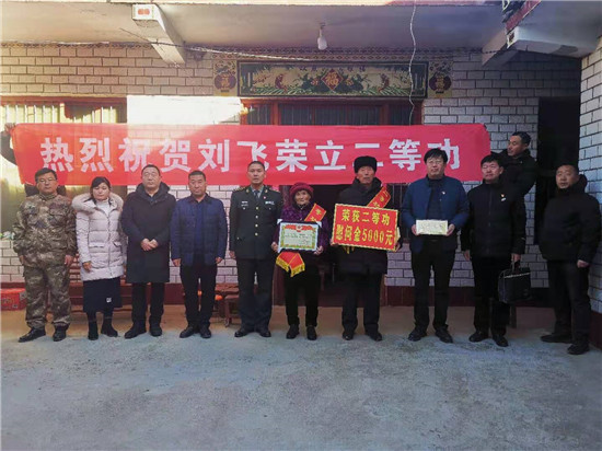 近日,周口市淮陽區(qū)人武部與區(qū)退役軍人事務局相關領導,來到該區(qū)四通鎮(zhèn)孔北行政村劉莊村,為在部隊榮立二等功的現(xiàn)役軍人劉飛的父母送去立功喜報,并送上慰問品及慰問金。臨走,劉飛的父親劉啟來說:“請領導放心,俺會讓孩子在部隊更加安心服役,力爭取得更大成績,多為家鄉(xiāng)增光添彩?!保◤埲?張雙斌 攝影報道)