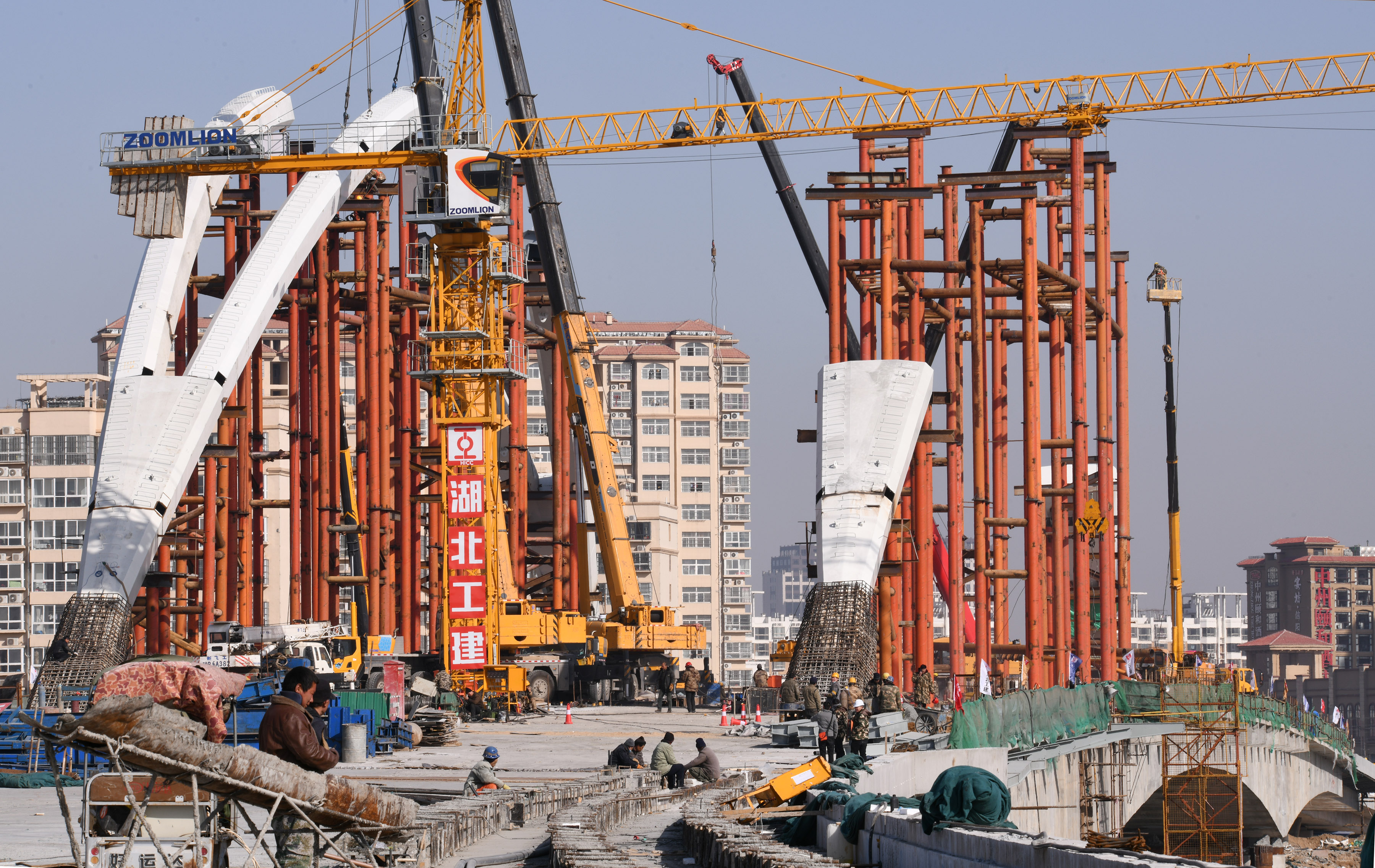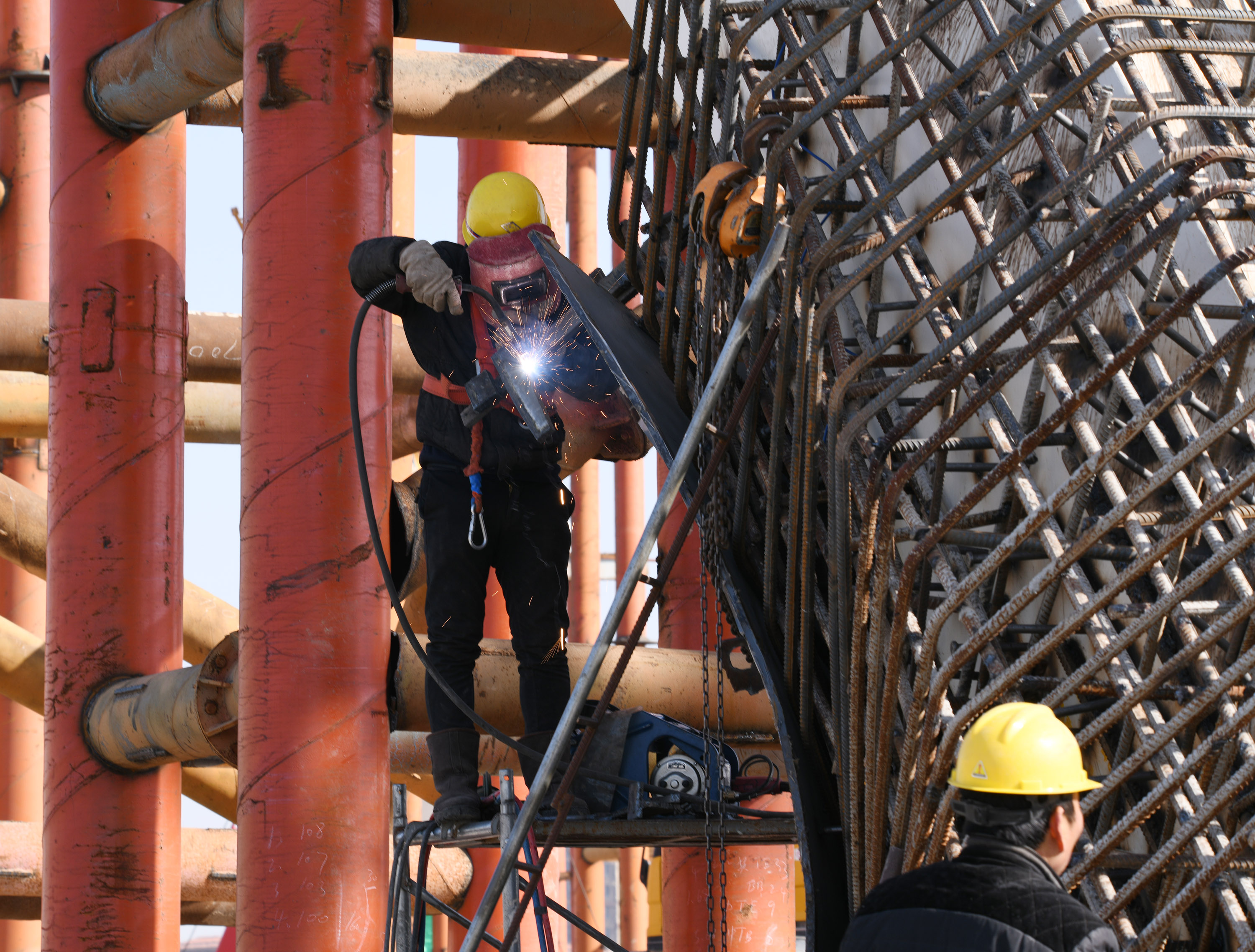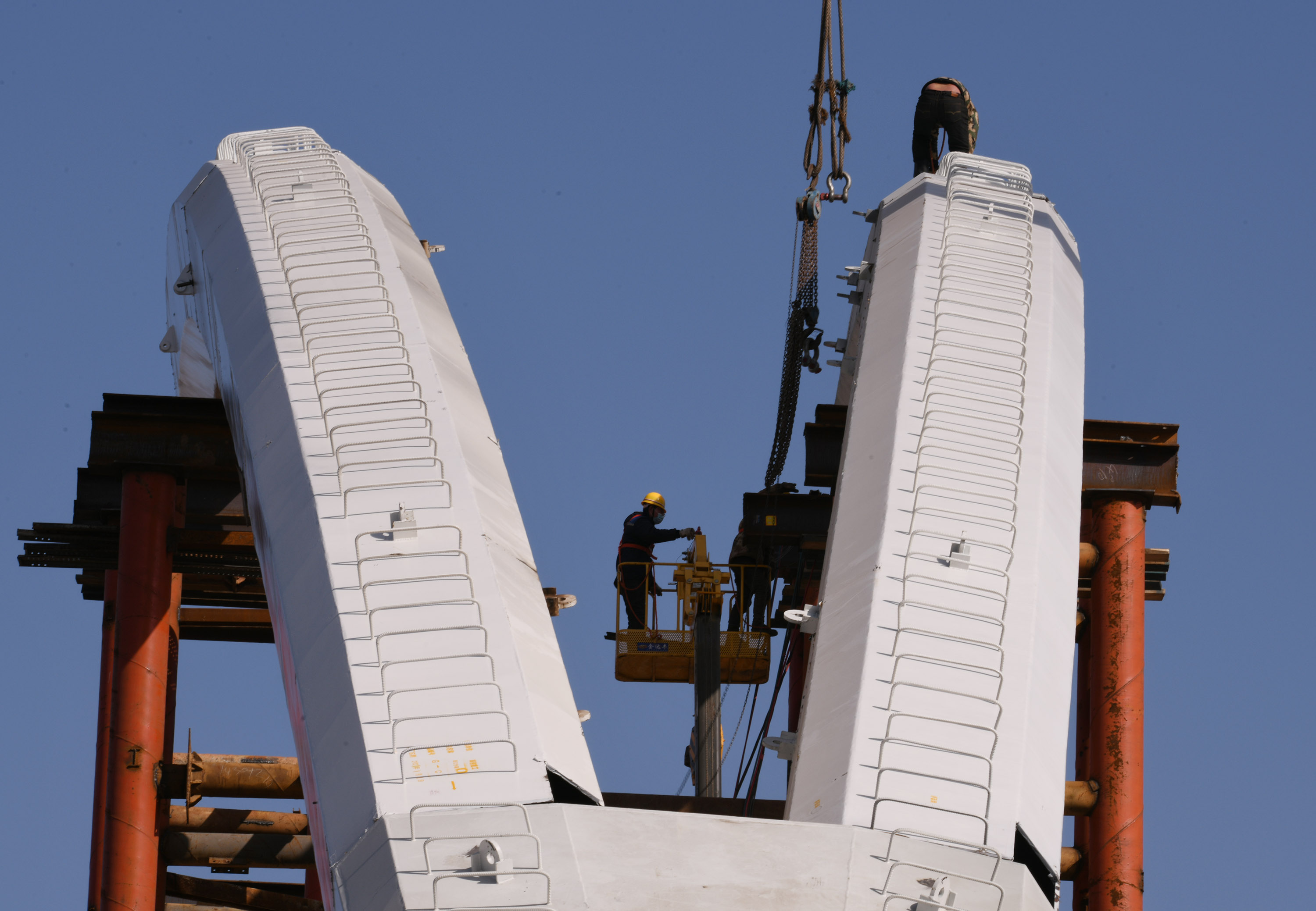 “一輪明月照古城”是中原路跨沙潁河大橋在諸多跨沙潁河大橋中獨居特色的風情。眼下,中原路跨沙潁河大橋合攏之后,橋面建設(shè)處于緊鑼密鼓之中,并開始進入安裝“月亮”施工階段。記者在施工工地看到,吊車往來,吊臂上下吊裝著材料,隨著工人們忙碌地焊接、安裝,“月牙”已經(jīng)乍現(xiàn)。