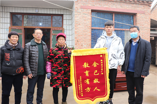 得知張廣坤所在學(xué)校的領(lǐng)導(dǎo)和老師要來(lái)村子,被救4歲男孩張子豪的奶奶帶著事先制作的錦旗來(lái)到張廣坤家說(shuō),原本打算把錦旗送到學(xué)校,感謝陳州高中培養(yǎng)出廣坤這樣的好學(xué)生,是廣坤救了他們?nèi)摇Kf(shuō),事發(fā)當(dāng)天下午5時(shí),她在家做晚飯,一不留神,4歲的孫子獨(dú)自抱住球出門跑到村坑塘邊的空地上玩耍去了。玩耍中,孩子不慎將球踢進(jìn)了水塘?!?歲的孩子能懂啥,光想著撈他的皮球,水至脖頸,害怕了哭喊起來(lái)。當(dāng)日,附近沒(méi)有人,孩子身上又穿著襖,要不是被廣坤及時(shí)發(fā)現(xiàn),俺家的日子以后真沒(méi)法過(guò)?!敝v到這,男孩的奶奶直掉眼淚。