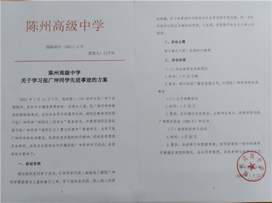 據(jù)陳州高中校長(zhǎng)白子興介紹,該校已經(jīng)向全校師生發(fā)起學(xué)習(xí)張廣坤先進(jìn)事跡的倡議,以助人為樂(lè)為榮,熱心主動(dòng)幫助他人。學(xué)校還將通過(guò)組織專題德育課、開(kāi)展演講征文活動(dòng)等,深入持久開(kāi)展學(xué)習(xí)榜樣活動(dòng)。