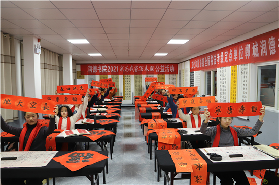 春節(jié)前夕,鄲城縣的書法家和書法愛好者們便更顯活躍,他們進(jìn)機(jī)關(guān)、進(jìn)企業(yè)、進(jìn)社區(qū)、進(jìn)學(xué)校、進(jìn)農(nóng)村,把富有中國特色的新春祝福,富含中國傳統(tǒng)文化的春聯(lián),送到千家萬戶。