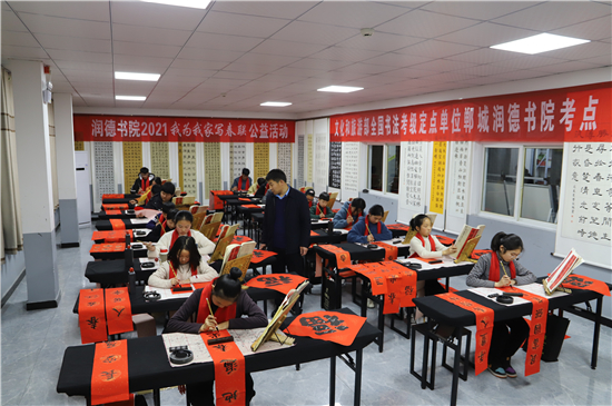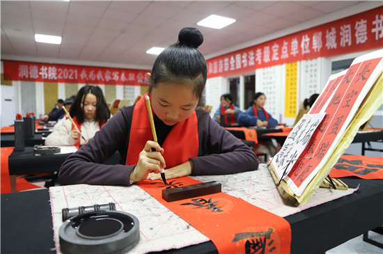 2月3日,記者在鄲城縣潤德書院看到,“我為我家寫春聯(lián)”活動正緊張地進(jìn)行著,數(shù)十名書法小學(xué)員端坐案前、從容執(zhí)筆、揮毫作書,一個(gè)個(gè)福字工整又靈活,一副副對聯(lián)娟秀又詩意。孩子們在屋內(nèi)全神貫注地寫字,把最美好的祝福用自己的所學(xué)展示給家庭;家長們在窗外掂腳張望,望子成龍、望女成鳳的心態(tài)表露無遺。