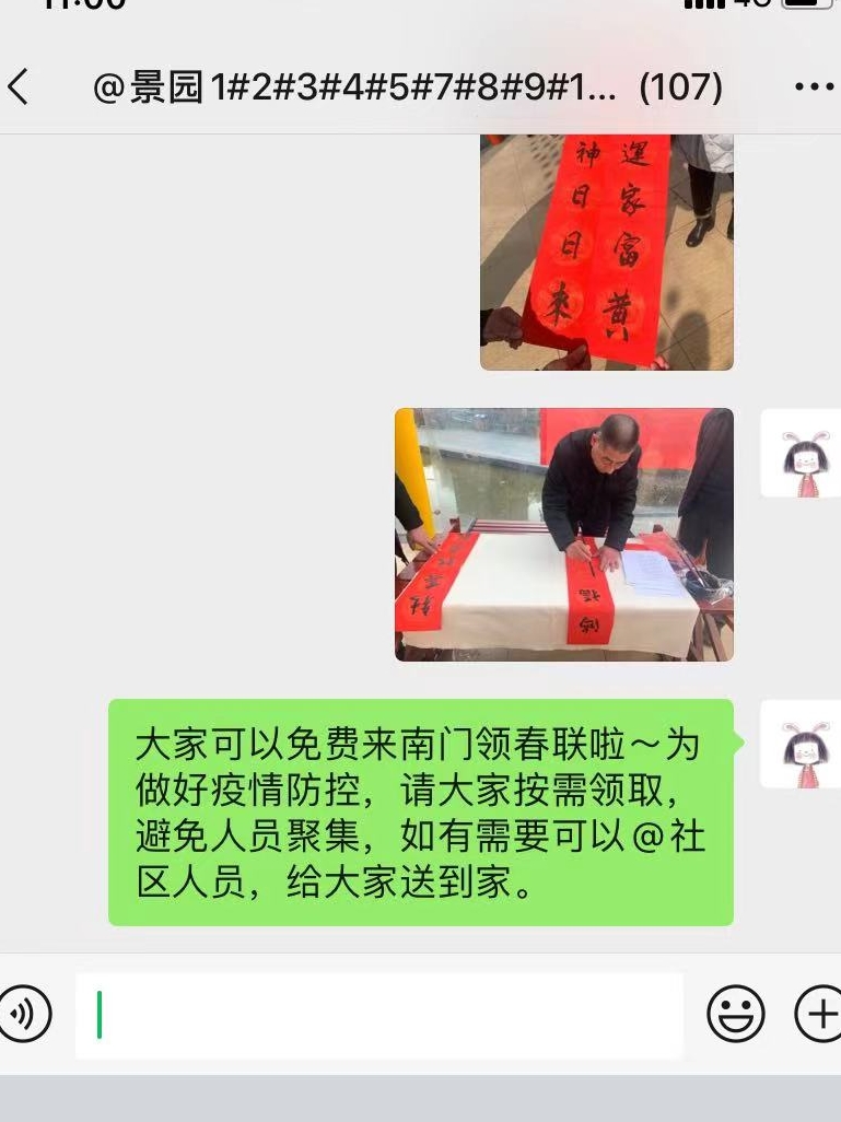 2月3日,為做好社區(qū)防疫工作,周口市城鄉(xiāng)一體化示范區(qū)景園社區(qū)一改往年現(xiàn)場寫、集中送的免費送春聯(lián)活動形式,把“寫春聯(lián)”與“送春聯(lián)”分開,通過微信群向社區(qū)居民展示書法愛好者的春聯(lián)作品,讓居民在線挑選,按需有序領(lǐng)取,避免人群聚集。同時,針對社區(qū)老年人等行動不便群體,主動送春聯(lián)上門,確保送“?!迸c防疫兩不誤。