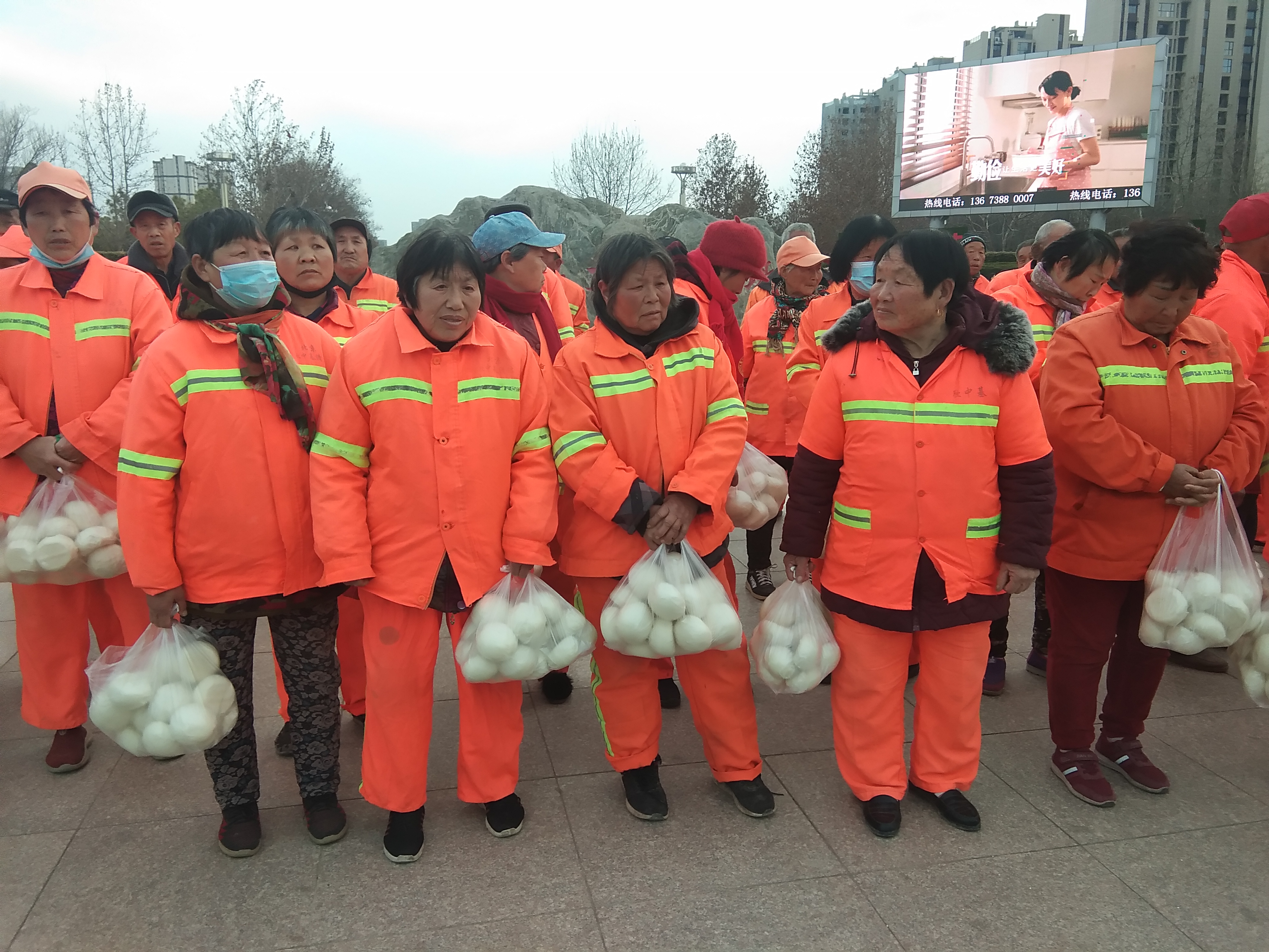 當(dāng)日下午5時(shí)許,胡環(huán)等30余名環(huán)衛(wèi)工人來(lái)到川匯區(qū)廣場(chǎng),周口市家庭教育學(xué)會(huì)工作人員依次為他們送上過(guò)年饅頭,拿到饅頭的環(huán)衛(wèi)工人臉上樂(lè)開(kāi)了花。