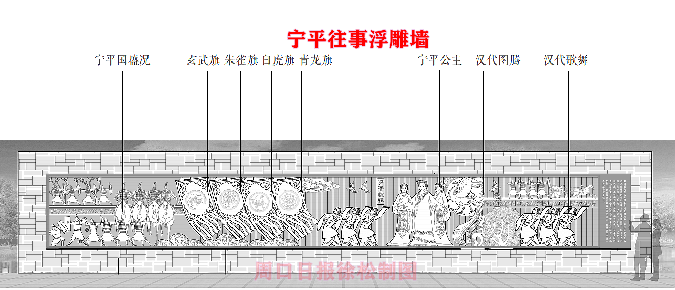 在縣委、縣政府綜合大樓東側(cè)的核心形象段,配合鄲城行政中心打造莊嚴(yán)、大氣氛圍的同時(shí),對(duì)鄲城歷史文化進(jìn)行了集中展示,包括鄲城的歷史沿革,鄲城的發(fā)展理念,歷史故事等。其中調(diào)水渠西側(cè)以現(xiàn)有人民廣場(chǎng)對(duì)應(yīng)的綠地為基礎(chǔ),設(shè)置了較多的歷史文化節(jié)點(diǎn)。如調(diào)水渠新華路橋頭北側(cè)的廉政文化廣場(chǎng),講述了漢朝名臣汲黯的故事。汲黯為人耿直,直諫廷諍,親政愛民,敢于承擔(dān)責(zé)任,漢武帝劉徹稱其為“社稷之臣”。汲黯廉政廣場(chǎng)建設(shè)在此處更有著深遠(yuǎn)的意義,它一方面提醒老百姓要了解歷史、敬畏先賢,同時(shí)也激勵(lì)著鄲城縣的各級(jí)黨員干部要在習(xí)近平新時(shí)代中國(guó)特色社會(huì)主義思想引領(lǐng)下,“不忘初心、牢記使命、廉潔奉公、一心為民”。