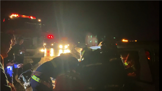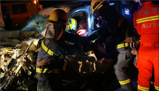 由于面包車內(nèi)有被困人員,需要消防救援人員到達現(xiàn)場使用專業(yè)破拆工具進行救援。示范區(qū)消防大隊接警后立即調(diào)派2部消防車10名指戰(zhàn)員前往現(xiàn)場。指戰(zhàn)員到達現(xiàn)場后利用搶險救援車對事故車輛進行牽引,擴大救援空間以便對被困司機進行施救,同時利用破拆工具將面包車進行破拆便于解救被困小女孩,當晚8時39分,兩人被救出并移交于醫(yī)護人員接受進一步治療。③5