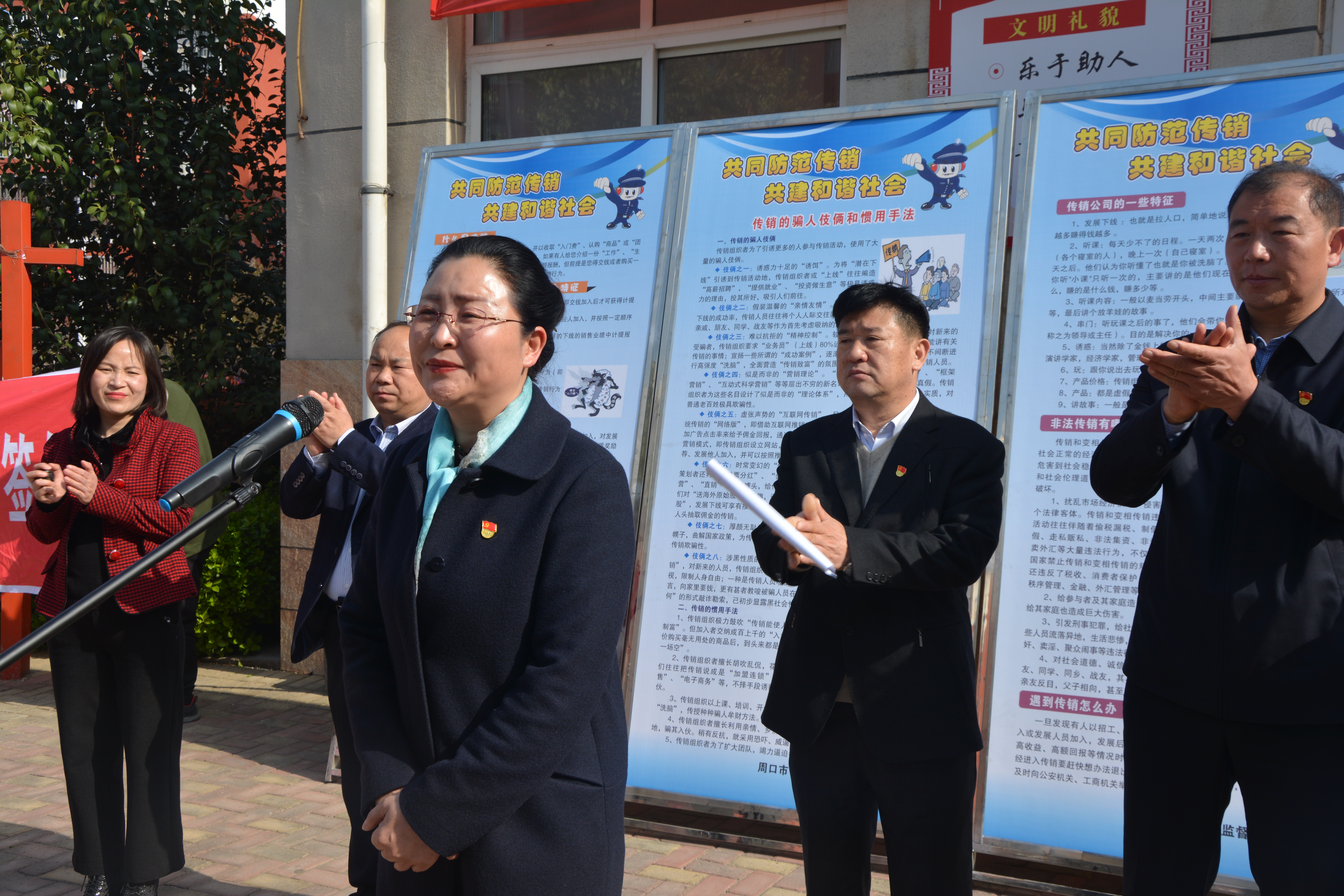 市市場監(jiān)管局二級高級主辦王樹平,港區(qū)打擊傳銷工作領(lǐng)導(dǎo)小組組長、黨委委員、紀(jì)委書記李素芹出席活動,市市場監(jiān)管局公平交易科科長豐亞偉、主任科員孟金鳳,港區(qū)管委會維穩(wěn)創(chuàng)新辦、安全辦、李埠口鄉(xiāng)政府負(fù)責(zé)人,周口市公安局港區(qū)分局民警輔警代表、各行政村分管同志、三個小區(qū)物業(yè)公司代表,市場監(jiān)管局港區(qū)分局全體同志,周口日報社等新聞單位以及前來參觀的群眾參加了活動。港區(qū)打擊傳銷工作領(lǐng)導(dǎo)小組辦公室主任、市場監(jiān)管局港區(qū)分局局長崔健作創(chuàng)建動員講話。他指出,嚴(yán)厲打擊傳銷違法行為,增強(qiáng)廣大群眾識別傳銷、抵制傳銷的能力,發(fā)動社會力量群防群控,是加強(qiáng)平安建設(shè),打造平安港區(qū),進(jìn)一步促進(jìn)社會和諧穩(wěn)定的重要舉措。開展無傳銷社區(qū)村創(chuàng)建活動,就是動員全社會特別是基層派出所、市場監(jiān)管所、社區(qū)(村)等力量,展開群防群控,重點加強(qiáng)對流動人口密集、情況復(fù)雜區(qū)域的檢查力度,形成縱橫交錯、內(nèi)外結(jié)合、上下聯(lián)動的網(wǎng)格體系,全力擠壓傳銷活動生存空間,始終保持對傳銷的高壓態(tài)勢,增強(qiáng)群眾抵制傳銷的自覺性和積極性,鏟除傳銷滋生的土壤,推進(jìn)打擊傳銷工作再上新臺階。