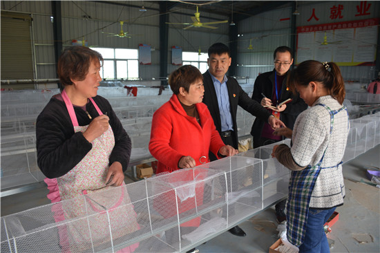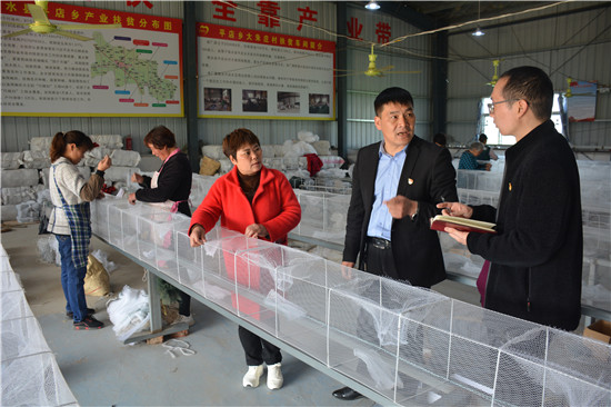 4月11日,商水縣平店鄉(xiāng)大朱莊村扶貧車間里留守女工正在編織漁網(wǎng)。該縣各級紀(jì)檢部門切實加強對扶貧資金資產(chǎn)的監(jiān)督管理,確保了扶貧項目產(chǎn)業(yè)正常運行,有效促進(jìn)了廣大留守婦女家門口就業(yè)增收。圖為縣鄉(xiāng)紀(jì)委干部在扶貧車間調(diào)查了解資產(chǎn)管理群眾收益工人收入等情況。
