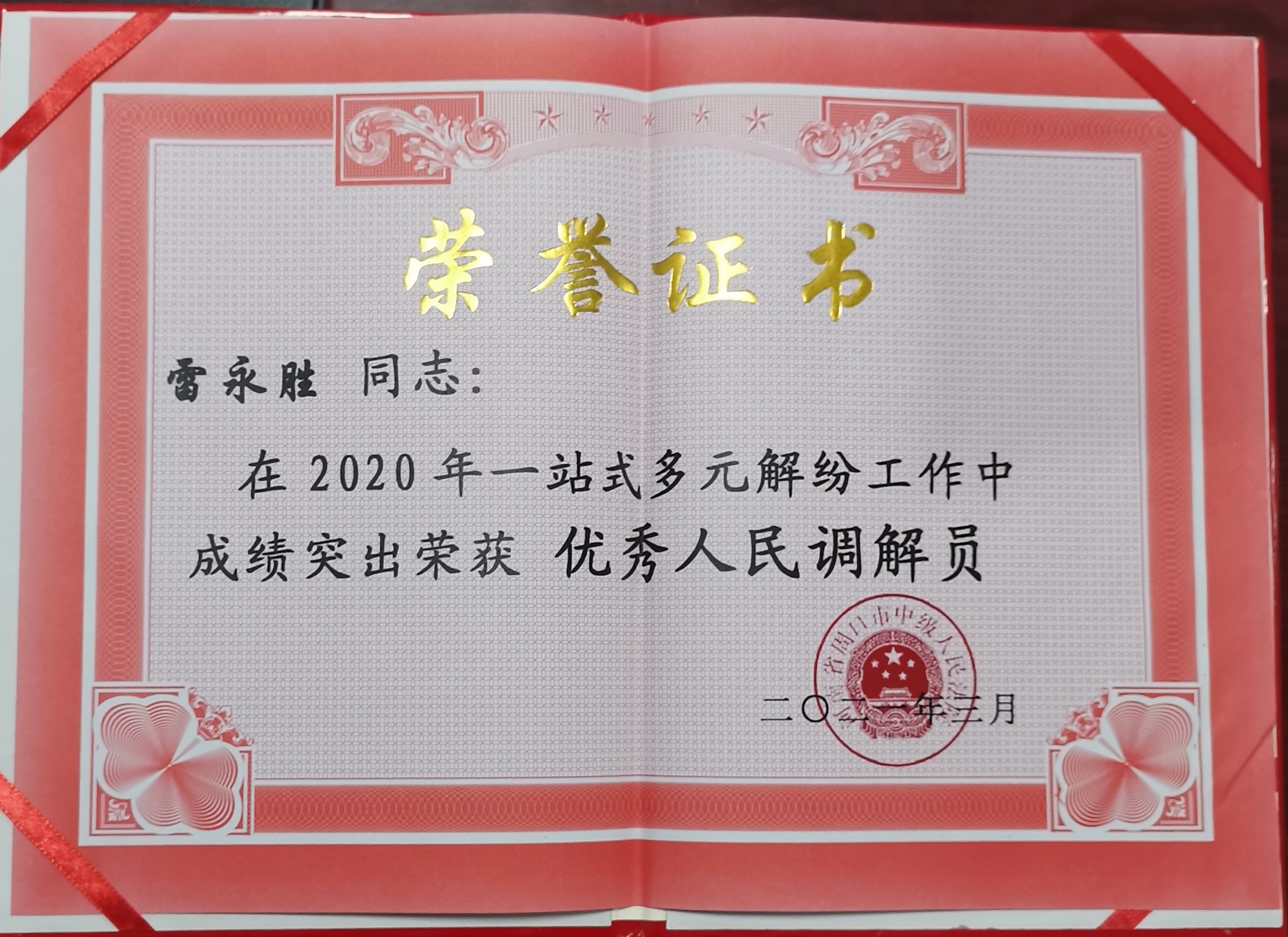 自2020年5月以來(lái),雷永勝調(diào)解員已累計(jì)接受各類案件近200件,成功調(diào)解近百件,助力法院訴前調(diào)解工作邁入先進(jìn)行列,化解了大量社會(huì)矛盾,為維護(hù)社會(huì)和諧穩(wěn)定作出了積極貢獻(xiàn)。日前,雷永勝被周口市中級(jí)法院評(píng)為“2020年度優(yōu)秀人民調(diào)解員”。