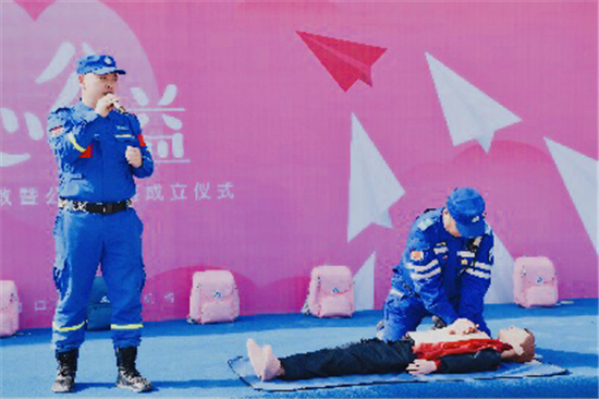 活動現(xiàn)場,藍天救援隊隊長孟坤以多年救援經(jīng)驗,與隊員們互相配合,演示如何正確穿戴救生衣、如何正確實施心肺復蘇術等,還生動演繹了當學生遇到有人落水等突發(fā)情況,如何在保證自己不受傷害的情況下實施救援。