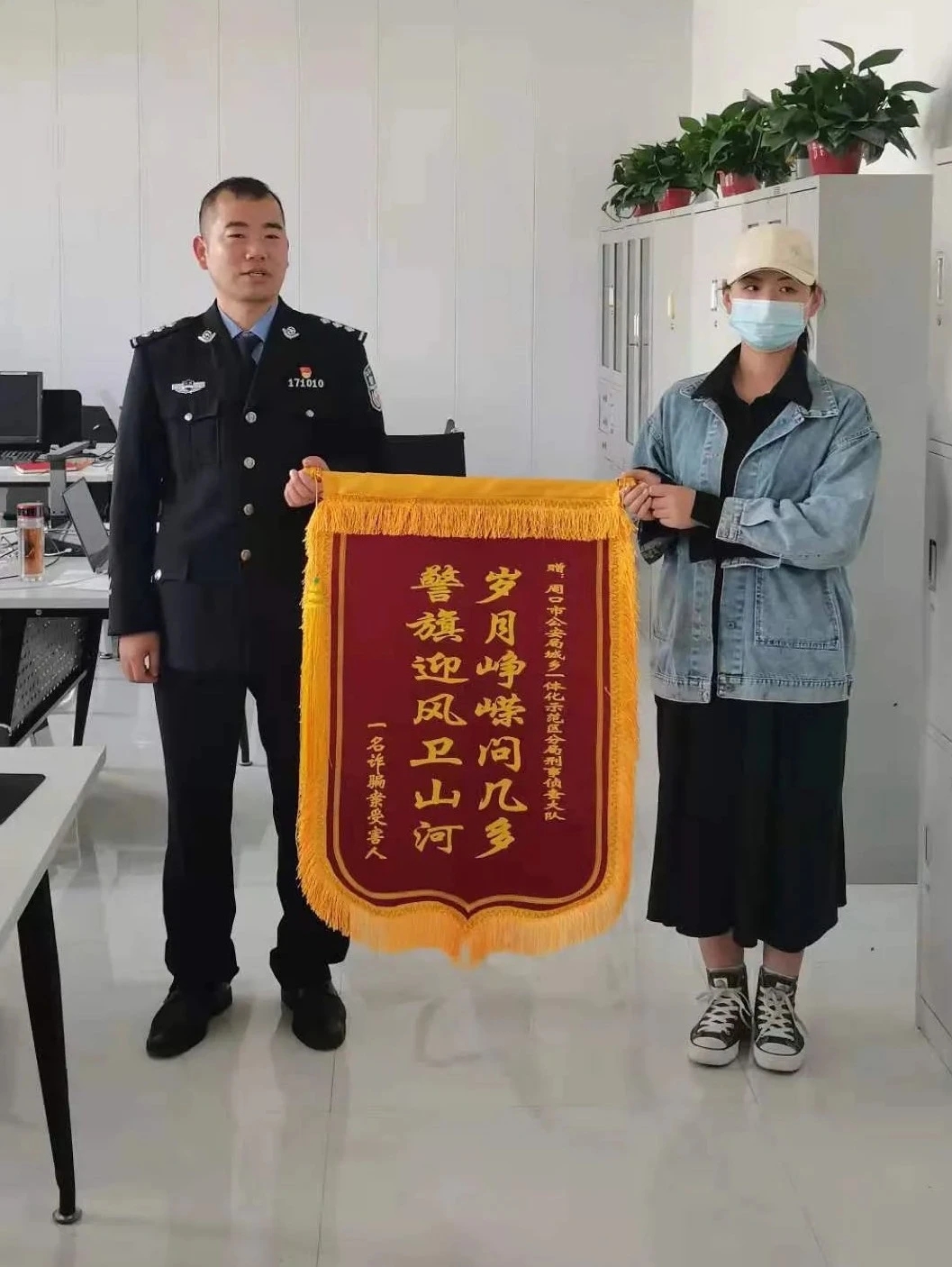周口日報·周道客戶端記者 侯國防記者從周口市公安局獲悉,貴州男子魏某利用周口一高校女生心思單純,騙取其6000多元。近期,周口市公安局示范區(qū)分局通過積極工作,南下貴州,在當?shù)鼐街С峙浜舷拢晒⒎缸锵右扇宋耗匙カ@,并追回該女生被騙的錢財,為受害人挽回了經(jīng)濟損失。受害人為此特意贈送一面錦旗表示感謝。