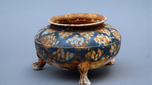 周口市博物館陳列著一件唐代藍釉三彩爐,它整體施藍釉,白黃交錯,挺著圓圓的肚子在唐三彩隊伍里高冷“上線”、“C位”出道。