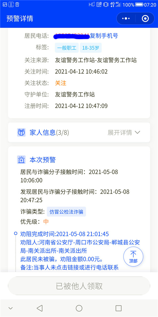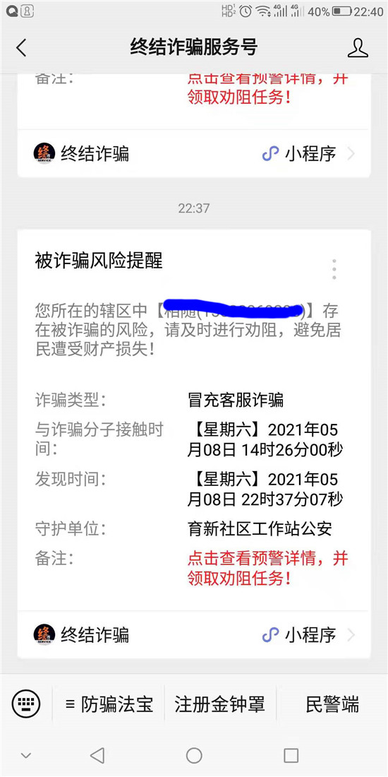 5月8日,鄲城縣公安局南關(guān)派出所社區(qū)民警收到“金鐘罩”推送的反詐預警信息,轄區(qū)居民郭某有受騙風險,社區(qū)民警第一時間聯(lián)系郭某核實了解相關(guān)情況并及時予以制止。