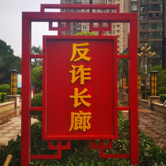 單元樓入戶門內(nèi)外兩側(cè)都張貼有反詐宣傳畫;物業(yè)服務(wù)臺(tái)桌面上打印有“金鐘罩”注冊(cè)二維碼,方便進(jìn)出居民注冊(cè);反詐長廊既有醒目標(biāo)語又有防騙妙招……5月20日下午,川匯區(qū)首個(gè)“無詐小區(qū)”——“金色東方”小區(qū)正式揭牌。