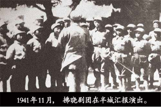 1938年深秋,劇團(tuán)到泌陽縣鄧莊鋪演出,群眾自動地找木棍、找門板、挖土埋柱子,很快搭起一座戲臺,掛上幕布,點(diǎn)燃油燈,男女老少坐在戲臺前的空地上。戲臺上先是演員們合唱抗日歌曲《新四軍軍歌》《游擊隊歌》《到敵人后方去》等,后演出話劇《突擊》。當(dāng)劇中的老爺爺抱著被日寇殺死的孩子,含淚控訴敵人的暴行時,臺下的觀眾禁不住地憤怒高呼:“打倒日本帝國主義!把日本鬼子趕出中國!”1939年11月初,徐海東隨劉少奇由竹溝到華中路過新興集,彭雪楓命拂曉劇團(tuán)組織一個晚會,以示熱烈歡迎。拂曉劇團(tuán)接受任務(wù)后,大家爭分奪秒,只用了一天時間,就集體創(chuàng)作排練出京劇《徐海東粉碎日寇“掃蕩”》,第二天就在歡迎晚會上演出。
