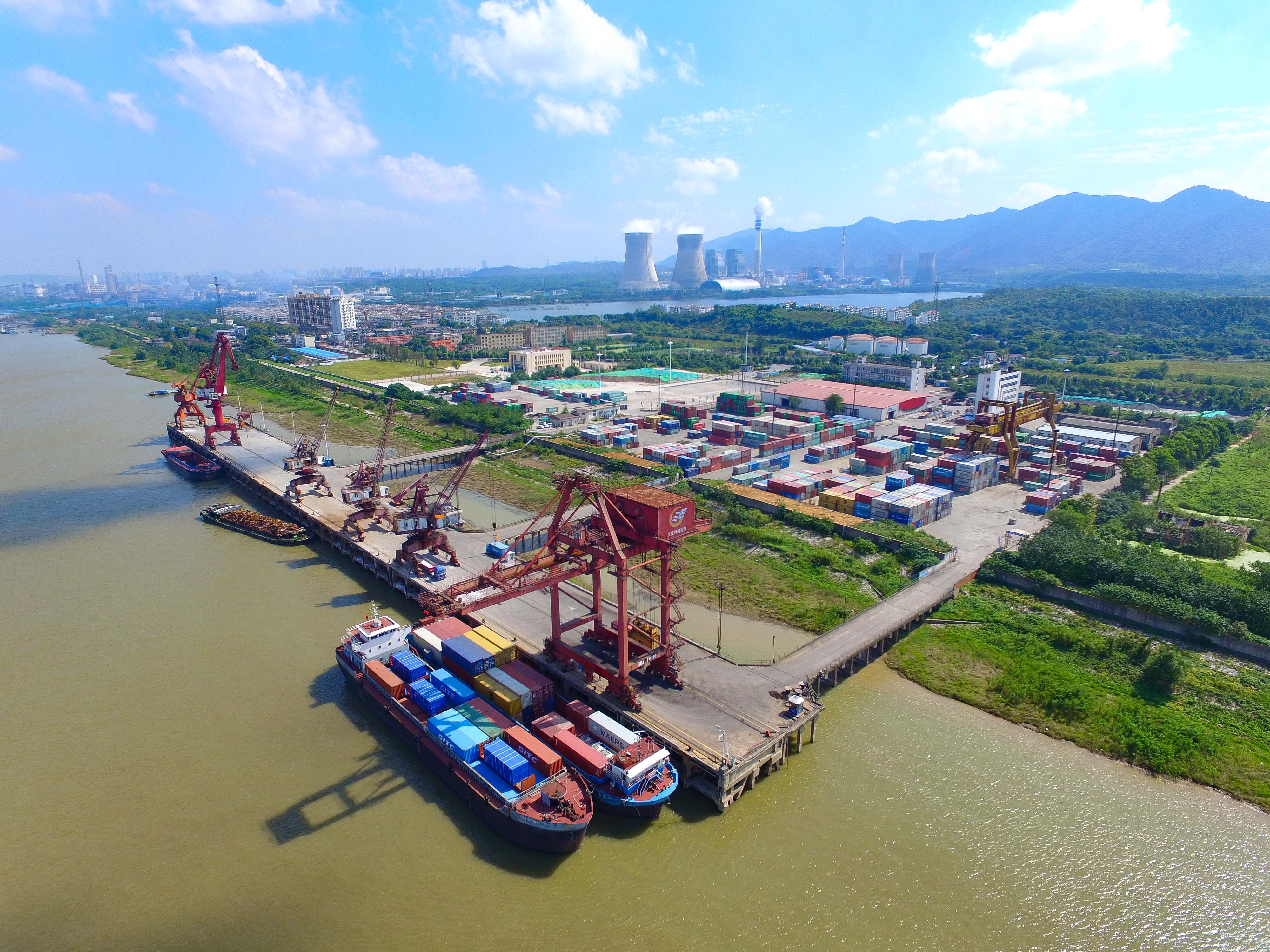 圖3:在安徽銅陵港長(zhǎng)江外貿(mào)碼頭,港口機(jī)械在裝卸集裝箱物資。安徽銅陵是我國重要的銅工業(yè)基地,銅陵港是長(zhǎng)江萬噸級(jí)輪船終點(diǎn)港。銅陵日?qǐng)?bào)記者 詹俊 攝