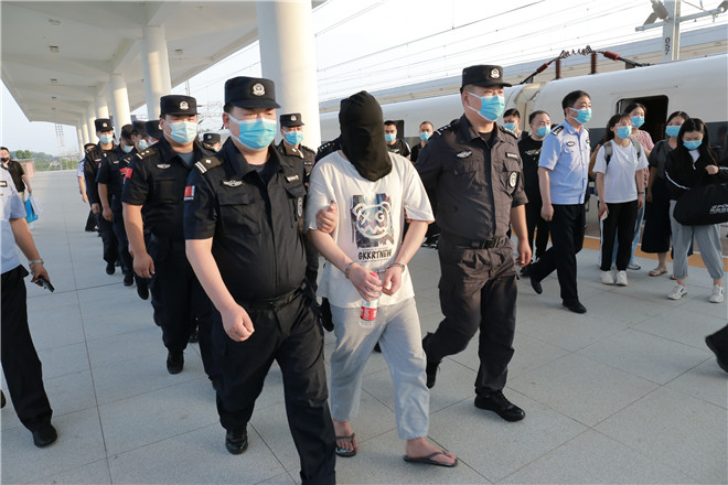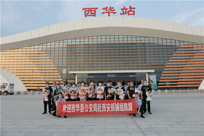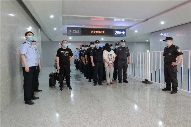 當天,西華縣公安局在鄭阜高鐵西華站舉行歡迎儀式,迎接赴西安抓捕組凱旋歸來。特警在站臺上排列整齊、嚴陣以待,列車準時??康秸荆?名犯罪嫌疑人隨即被押解下車,全副武裝的特警立即上前進行押解交接,押往在高鐵出站口等候的裝甲車上。至此,歷經(jīng)三天三夜,一起電信網(wǎng)絡詐騙團伙案成功告破。