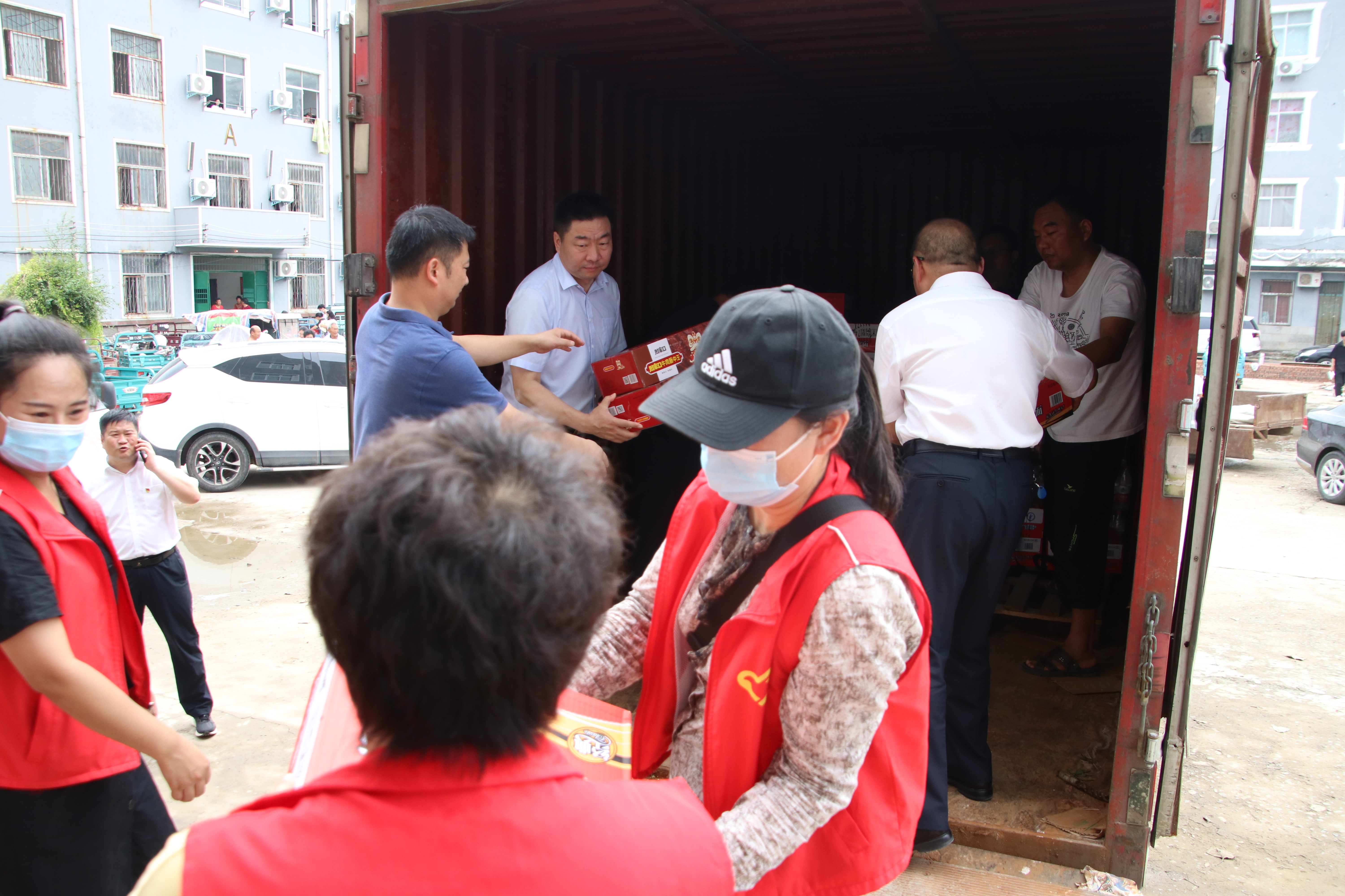 7月22日,周口市農信辦黨組書記盛毅一行赴扶溝二高安置點送去200箱飲用水、100箱方便面、100箱火腿腸、50箱面包等物資,看望慰問安置點工作人員和因災轉移的群眾。(李鳳霞 林根深攝)