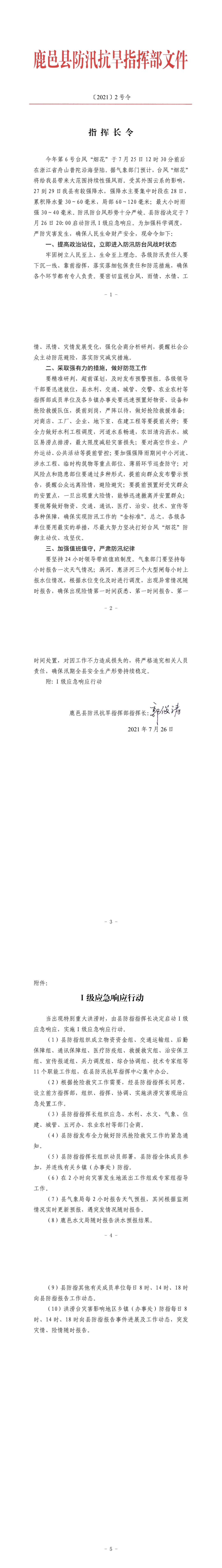 鹿邑縣防汛抗旱指揮部于7月26日晚8點啟動防汛Ⅰ級應急響應,并發(fā)布《指揮長令》2號,從防汛Ⅳ級應急響應提升到防汛Ⅰ級應急響應,動員全縣上下積極行動,做好防范,應對臺風“煙花”帶來大范圍持續(xù)性強風雨。