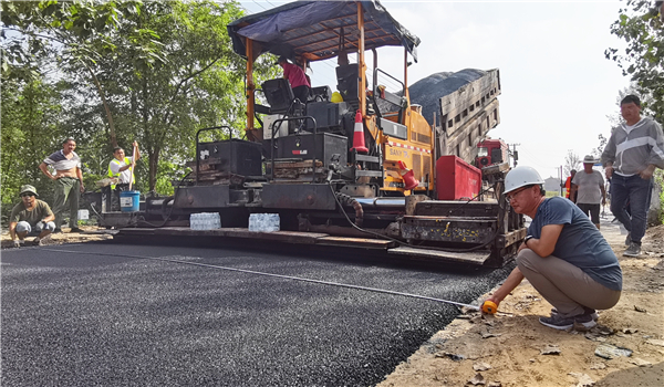 路面鋪油作業(yè)從淮陽(yáng)區(qū)葛店鄉(xiāng)與鄲城縣李樓鄉(xiāng)交界處開(kāi)始,一臺(tái)攤鋪機(jī)鋪設(shè)寬度為7米,壓實(shí)厚度為5厘米,以平均每分鐘5米的速度前行,數(shù)輛運(yùn)料車輪流供料給攤鋪機(jī)。攤鋪機(jī)過(guò)后,兩臺(tái)壓路機(jī)交替運(yùn)行,立即把路面壓實(shí);兩臺(tái)灑水車配合作業(yè),路面一次成型,寬闊而平坦。