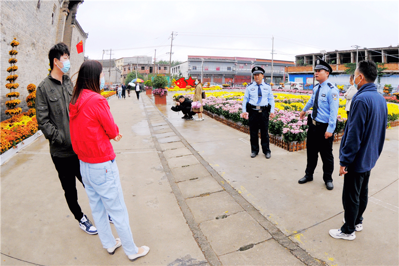 國慶七天長假,商水縣公安局在致力文旅創(chuàng)意的葉氏莊園、水韻章華等景區(qū)內加強巡邏執(zhí)勤,維護景區(qū)的安全穩(wěn)定,為來自全國各地的游客提供服務。圖為10月7日,商水縣公安局鄧城派出所民警在有“中原小故宮”之稱的葉氏莊園景區(qū)菊展現(xiàn)場巡邏執(zhí)勤、服務游客。