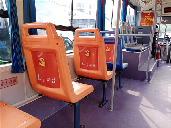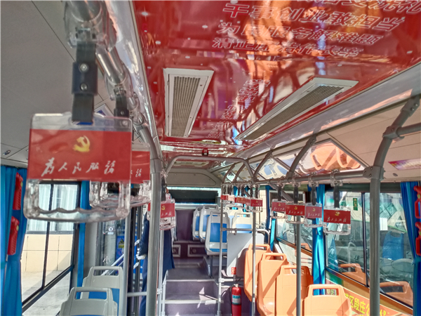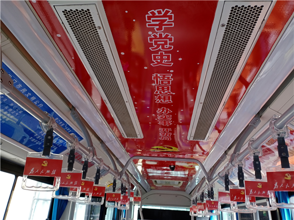 圖片說明:10月25日,記者在周口市公交總公司院內(nèi)看到,一輛車頭前印有“紅色主題班線”標(biāo)識(shí)的公交車格外引人注目,雖然該車的外形與其他車差別不大,可是車廂內(nèi)貼滿了紅色標(biāo)語口號(hào),給人耳目一新的感覺。記者看到,車廂內(nèi)的扶手、座椅及車頂上都貼有“為人民服務(wù)”“學(xué)黨史、悟思想、辦實(shí)事、開新局”“革命小故事”等宣傳內(nèi)容。③2