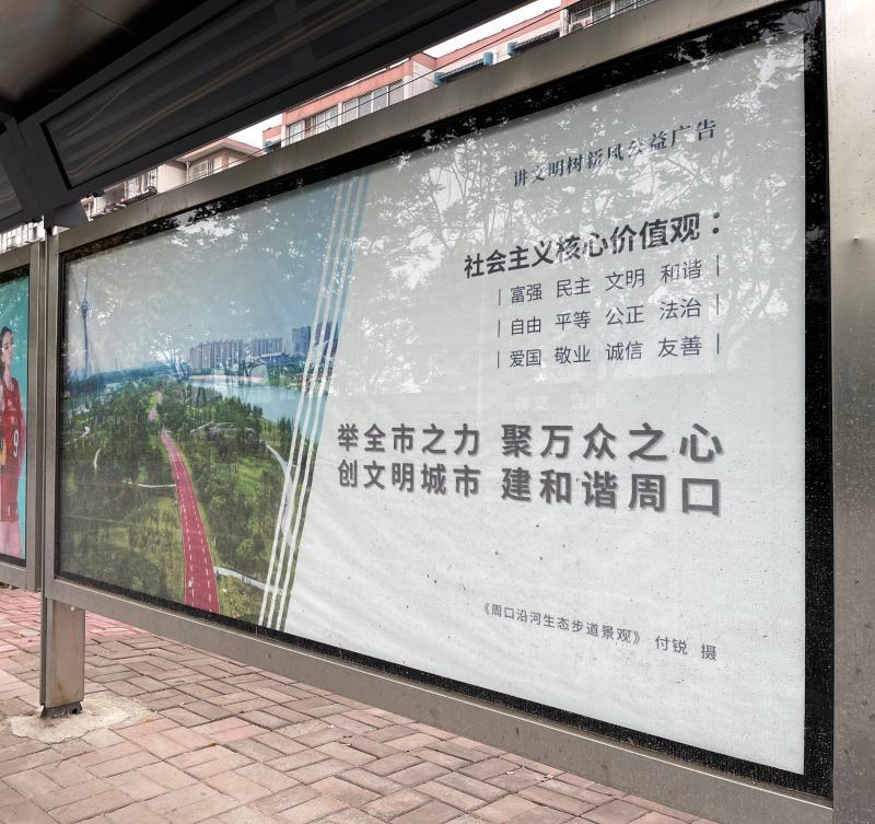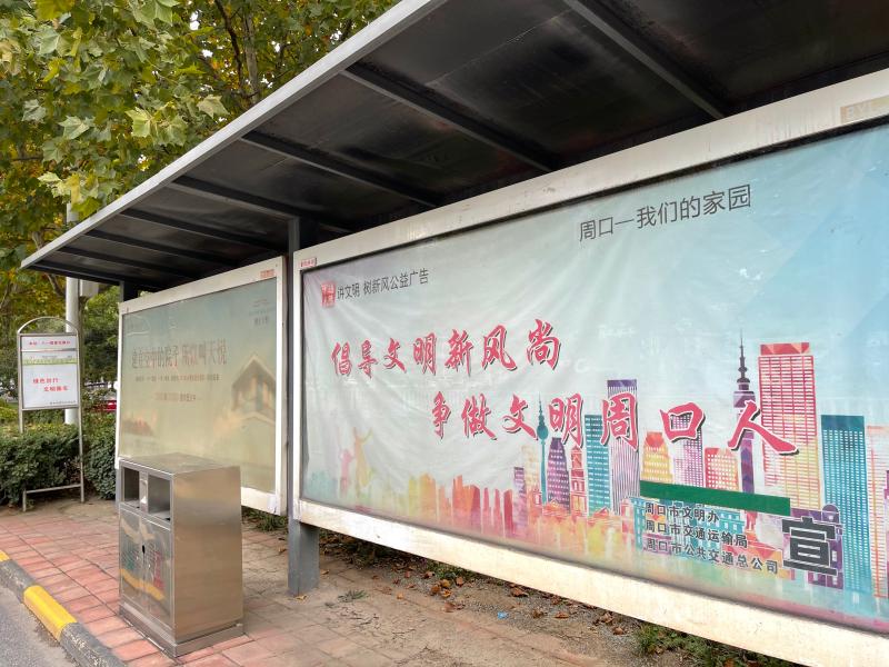 公交站臺(tái)作為城市文化傳播的符號(hào)之一,對(duì)城市形象的提升有著重要意義。10月26日,記者走訪了我市中心城區(qū)公交候車臺(tái),隨處可見的公益廣告牌引人注目,“文明與你同行,創(chuàng)建從我做起”“倡導(dǎo)文明新風(fēng)尚,爭做文明周口人”“舉全市之力,聚萬眾之心,創(chuàng)文明城市,建和諧周口”,一句句文明標(biāo)語為周口創(chuàng)建全國文明城市增光添彩。
