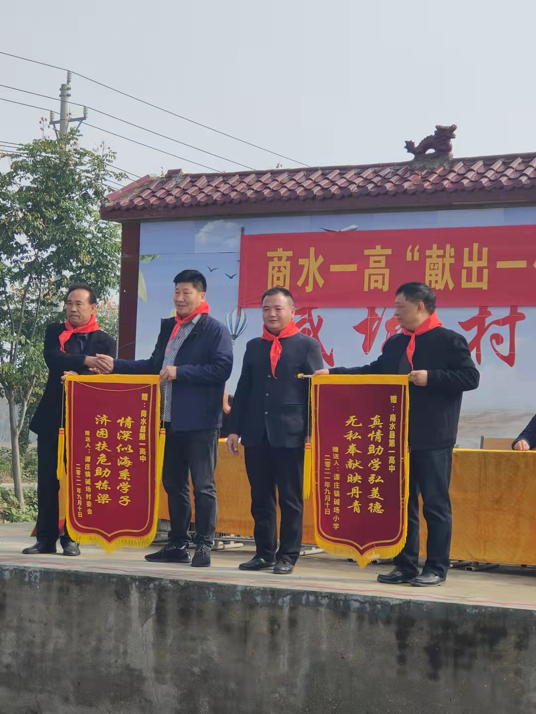 譚莊鎮(zhèn)堿場村村委會、譚莊鎮(zhèn)堿場小學分別向商水一高贈送內(nèi)容為“真情助學弘美德,無私奉獻映丹青”“情深似海系學子,濟困扶危助棟梁”的錦旗。