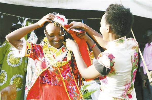 11月10日,學生在盧旺達卡永扎試穿中國服飾。