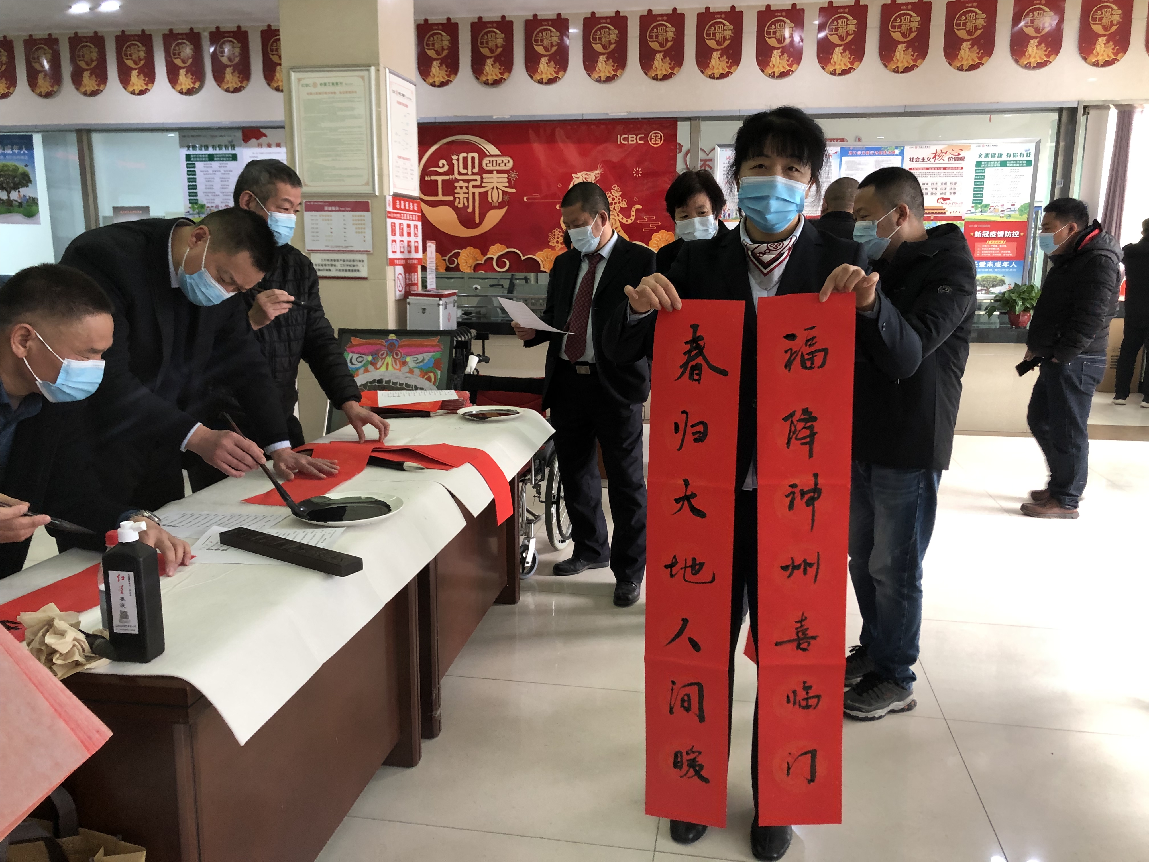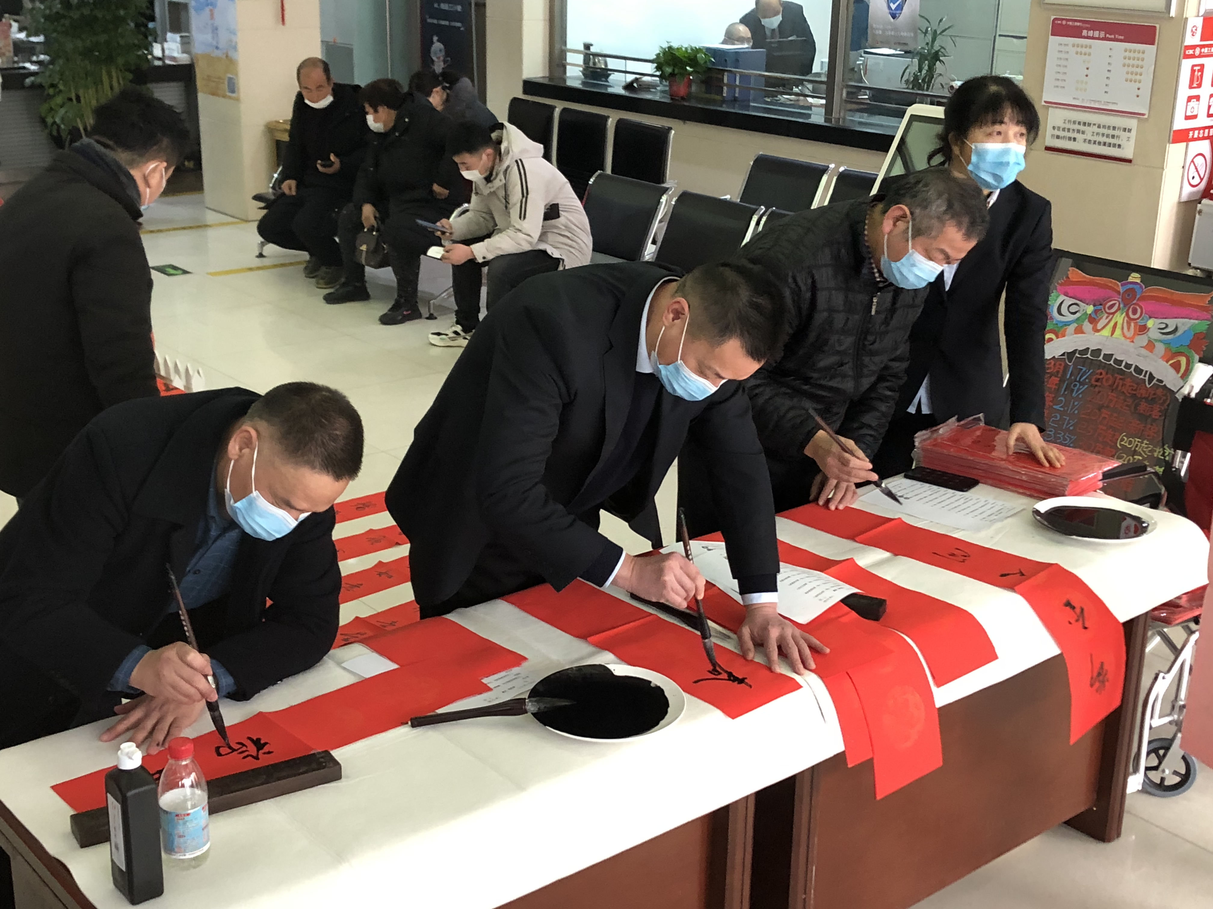 春節(jié)臨近,工行周口分行開展“寫春聯(lián)送福字”活動(dòng),精心組織本行書法協(xié)會(huì)會(huì)員分赴基層網(wǎng)點(diǎn),在營(yíng)業(yè)廳堂揮毫潑墨,為客戶寫春聯(lián)、送福字。把一幅幅盛贊祖國(guó)昌盛、人民安居樂(lè)業(yè)、新春祝福送給客戶。此次活動(dòng),該行共計(jì)為客戶送出春聯(lián)1300余幅,受到廣大客戶的稱贊。 李玉 攝①2