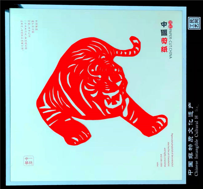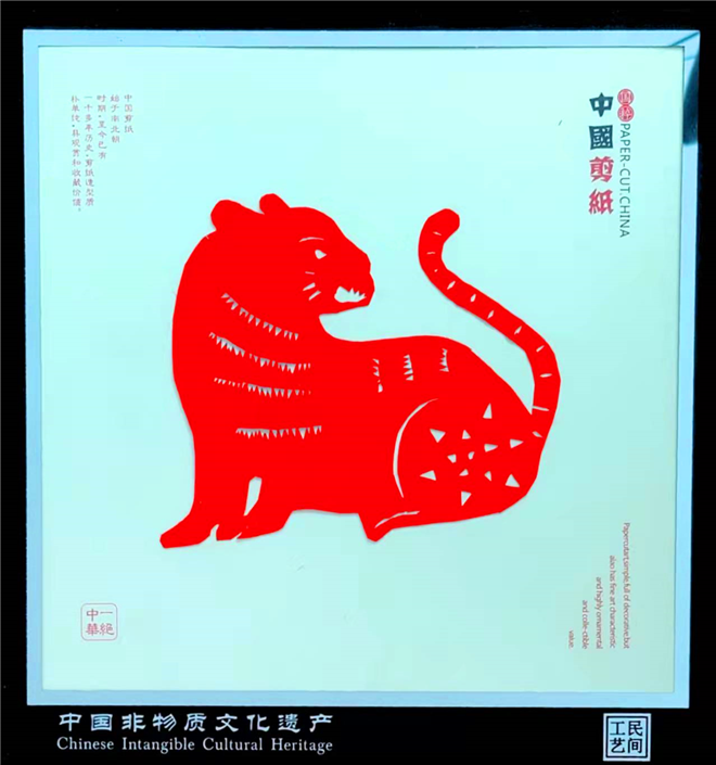 為了慶?;⒛辏醮好穭?chuàng)作的秸稈畫主要有《威震九霄》《虎之王者》《飛天神虎》等,此外,她還創(chuàng)作了兩幅剪紙作品,分別是《虎年組圖》和《虎之2022》。和剪紙作品相比,秸稈畫制作工序更加復(fù)雜,全憑手工完成,充分利用秸稈本身的紋理和質(zhì)地,結(jié)合顏色、溫度的變化,將畫面立體的呈現(xiàn)出來。其中,她創(chuàng)作的部分作品結(jié)合了唐卡的相關(guān)風(fēng)格和顏色配比,比如《威震九霄》中虎的形象所表現(xiàn)出來的力量感借鑒了唐卡中護(hù)法的力量感;《虎之王者》和《虎之2022》中對于藍(lán)色的運(yùn)用結(jié)合了唐卡中的藍(lán)色,代表了永恒不變,如同穹蒼攬護(hù)萬物之意。