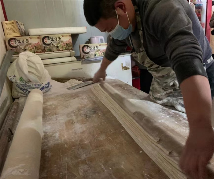 此時(shí),固墻鎮(zhèn)集市最低溫度為零攝氏度,40歲的王永強(qiáng)卻汗流浹背。他,正在自家面館里忙得熱火朝天。從14歲起,王永強(qiáng)就跟著表哥學(xué)習(xí)做手搟面,到現(xiàn)在已有26年的制作經(jīng)驗(yàn)?!斑^年這段時(shí)間一天搟10小時(shí)以上,能出個(gè)七八百碗,就這都賣不及?!蓖跤缽?qiáng)邊說邊做準(zhǔn)備工作,只見他將一盆醒好的、重40斤,用高筋面粉和鹽和好的面團(tuán)鋪在案板上,拿出一根一米五長(zhǎng)的鐵棍將面團(tuán)按壓平整,再用有十幾年歷史的搟面杖,邊鋪撒玉米淀粉、邊用力搟。1個(gè)小時(shí)后,面團(tuán)被搟至薄皮狀,最后按層折疊鋪好,用快刀切成相等寬度,撣走多余面粉,挽成麻花狀。如此,遇水不散、出水不沾、溫潤(rùn)光滑、筋而不膩的固墻手搟面就完成了。固墻手搟面最常見的做法是用大火多水煮沸后,撈起配以番茄雞蛋、蒜泥黃瓜,拌勻后享用。夾起一筷子面條,觀其形如玉帶臨風(fēng),察其色若飛雪粼粼,送入口中品其味,則似玉蘭入口,真是美哉!爽哉!