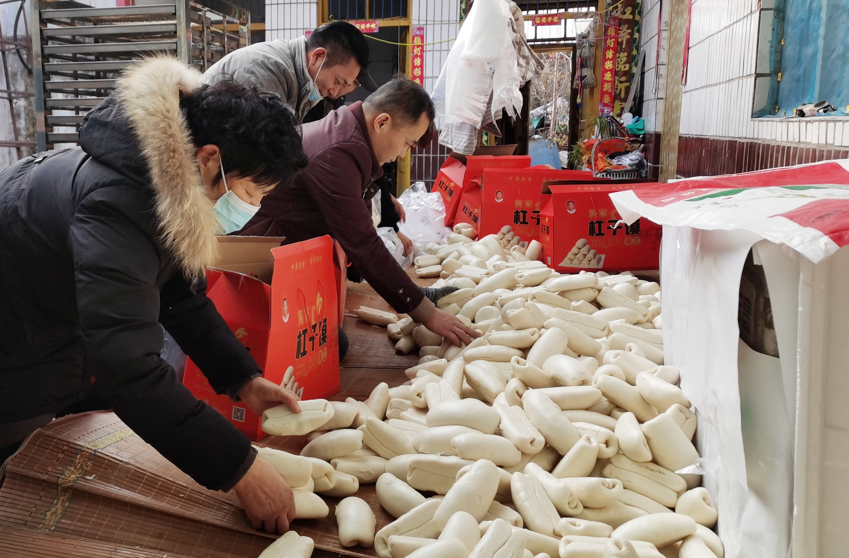 小伙子姓黃,20歲,他的父親不能說話,是殘疾人。趕到過年,店里非常忙碌,全家上陣制作杠子饃,小黃放假了就來店里幫忙。隨著時代發(fā)展,現(xiàn)在和面、分面劑都有機器,蒸饃也有蒸箱,一次能出1000多個,少了煙熏火燎,進入智能化、高效化的軌道。但杠子饃由于形狀特殊,加之過年期間需求量特別大,所以“做年饃”仍是辛苦活兒,需在頭天晚上將面摻上酵子(方言,即含有酵母的面團,也叫引酵)和好,放在溫暖處任其發(fā)酵。趕上年關這樣的旺季,往往需要幾十個人通宵達旦地加工,搟劑子、卷造型、二次發(fā)酵,徹夜不息。杠子饃干后不開裂,耐貯存,能放置一個月以上不變質(zhì),這是傳統(tǒng)工藝與現(xiàn)代技術相結(jié)合的成果。“周口人過年哪兒有不備饃的?你們看我這邊十來個箱子,每個箱子要裝50多個饃,都是要裝好寄到外地的,北京、上海的都有?!毙↑S說。
