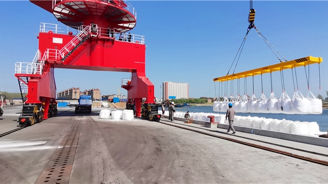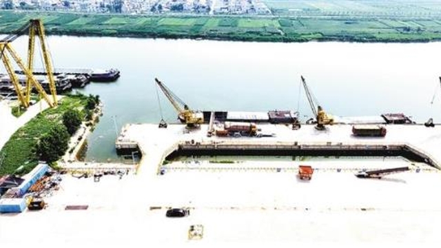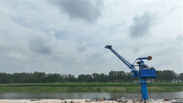 盛夏七月,在項(xiàng)城市東部的項(xiàng)城港,幾架“高聳入云”的新式固定式起重機(jī)的主體已安裝完畢,剩余的部件堆放在地上,巨大的框架和鮮紅的涂裝展示著它們的力量。一側(cè),千噸級(jí)貨輪正??吭陂L(zhǎng)長(zhǎng)的泊位前,起重機(jī)緩緩卸下貨艙內(nèi)的散貨。