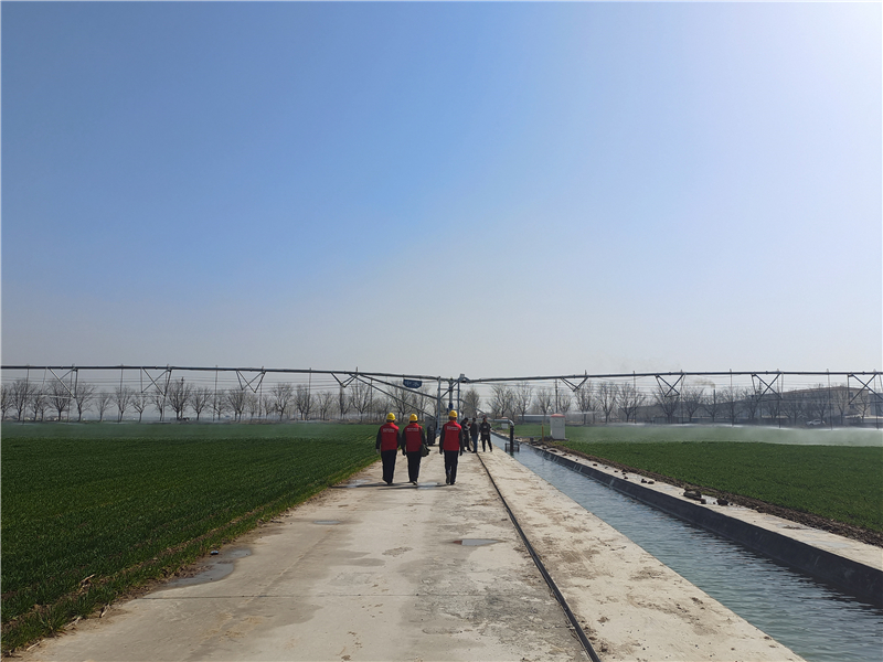 放眼望去,一座座白色的標準化通電機井房坐落在麥田地頭,源源不斷的井水流進蓄水池里,不斷冒出歡快的水花。一旁的大型電動平移式噴灌機把井水過濾后,澆灌出一片片盎然綠意。遠處身穿紅馬甲、頭戴安全帽的供電檢修人員正在對抽水專變進行認真細致地檢查。