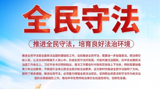 推進(jìn)全民守法是全面依法治國(guó)的基礎(chǔ)性工作。當(dāng)前推進(jìn)全民守法,需要進(jìn)一步加強(qiáng)普法,把法律交給人民,讓法治信仰根植于人民心中,形成全民守法的氛圍,才能共建法治國(guó)家。