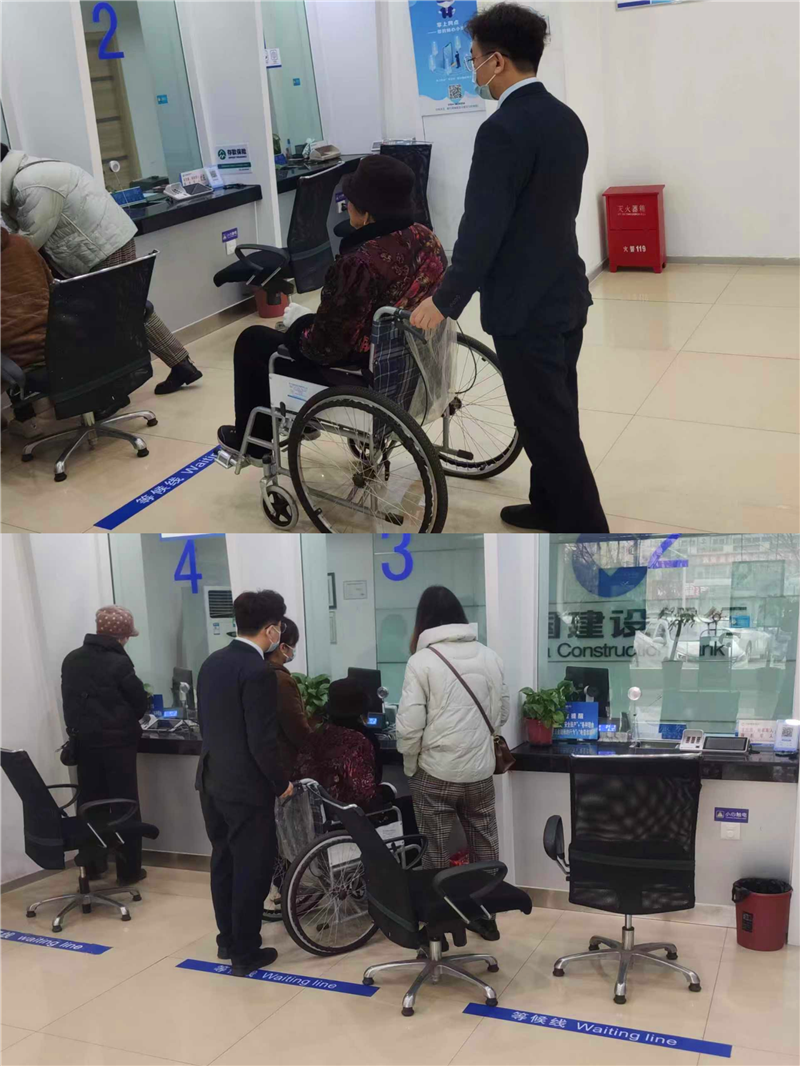 3月27日上午11點左右,項城蓮花大道支行大堂經(jīng)理張云磊在門口引導客戶時,發(fā)現(xiàn)兩位客戶扶著另一位客戶走進網(wǎng)點。注意到客戶雙腿行走不便,他立即推來輪椅,把客戶扶到輪椅上。三位客戶不熟悉銀行辦業(yè)務流程,大堂經(jīng)理張云磊全程跟隨指導辦理業(yè)務。經(jīng)詢問,大堂經(jīng)理得知客戶前來辦理社保卡激活業(yè)務,以便領取殘疾人補貼。大堂經(jīng)理立即幫他安排綠色通道,幫助家屬推輪椅到柜臺辦理,在一旁指導客戶填單跟簽名。