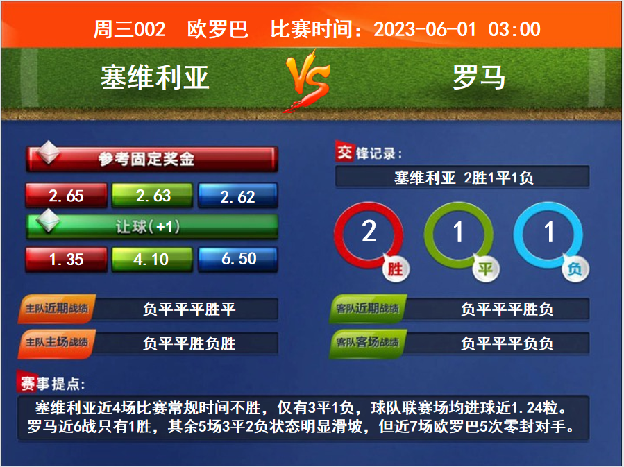 比賽時間:2023-06-01 03:00賽事提點:塞維利亞近4場比賽常規(guī)時間不勝,僅有3平1負,球隊聯(lián)賽場均進球近1.24粒。羅馬近6戰(zhàn)只有1勝,其余5場3平2負狀態(tài)明顯滑坡,但近7場歐羅巴5次零封對手。