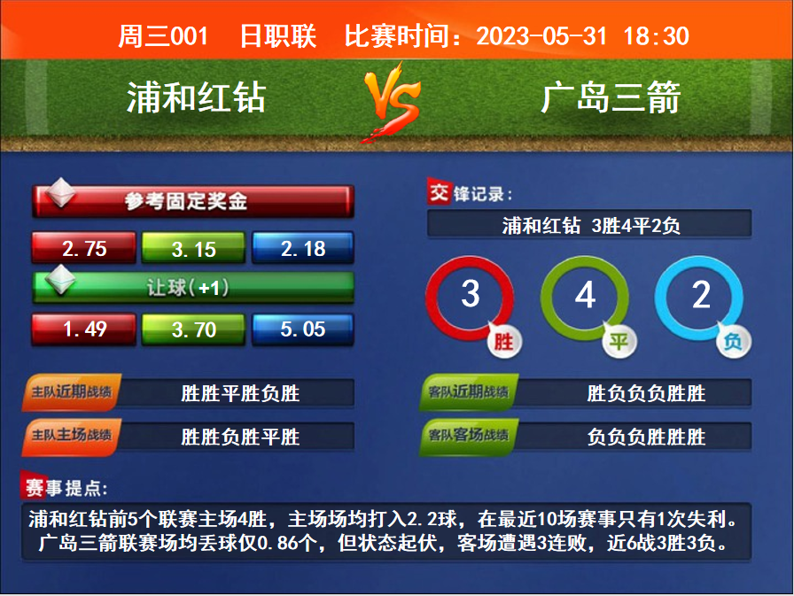 比賽時間:2023-05-31 18:30賽事提點:浦和紅鉆前5個聯(lián)賽主場4勝,主場場均打入2.2球,在最近10場賽事只有1次失利。廣島三箭聯(lián)賽場均丟球僅0.86個,但狀態(tài)起伏,客場遭遇3連敗,近6戰(zhàn)3勝3負。