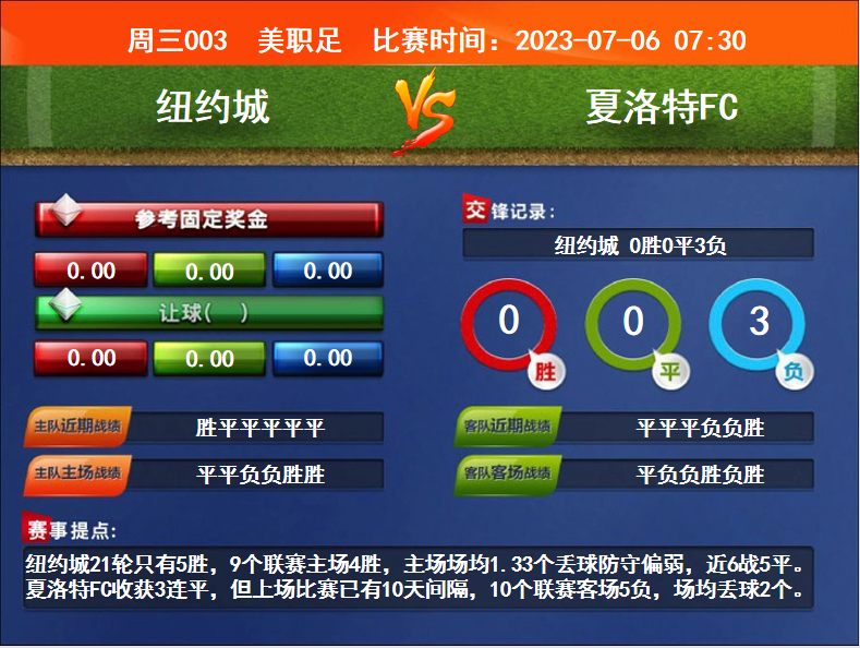 比賽時間:2023-07-06 07:30賽事提點(diǎn):紐約城21輪只有5勝,9個聯(lián)賽主場4勝,主場場均1.33個丟球防守偏弱,近6戰(zhàn)5平。夏洛特FC收獲3連平,但上場比賽已有10天間隔,10個聯(lián)賽客場5負(fù),場均丟球2個。