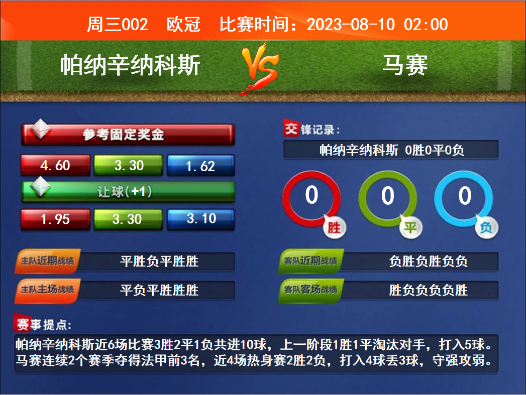 馬賽 比賽時間:2023-08-10 02:00賽事提點(diǎn):帕納辛納科斯近6場比賽3勝2平1負(fù)共進(jìn)10球,上一階段1勝1平淘汰對手,打入5球。馬賽連續(xù)2個賽季奪得法甲前3名,近4場熱身賽2勝2負(fù),打入4球丟3球,守強(qiáng)攻弱。