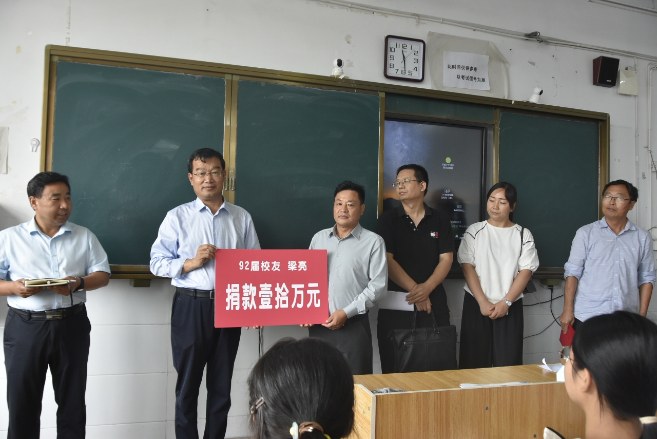 梁亮在發(fā)言中回憶了自己在母校求學(xué)時(shí)的點(diǎn)點(diǎn)滴滴,他感恩母校老師當(dāng)年的辛勤培養(yǎng),解釋了捐贈(zèng)的初衷,并莊嚴(yán)承諾:只要自己的企業(yè)不倒閉,就會(huì)把這項(xiàng)公益事業(yè)一直做下去。他希望“大梁班”全體同學(xué)聽老師的話,做規(guī)范的事。不怕苦,不怕累,找對學(xué)習(xí)方法,合理分配時(shí)間,想法設(shè)法提高學(xué)習(xí)效率,抵制一切不良誘惑,一心用在學(xué)習(xí)上。他祝愿全體同學(xué)都能考入自己理想的大學(xué),一定會(huì)實(shí)現(xiàn)自己的夢想!