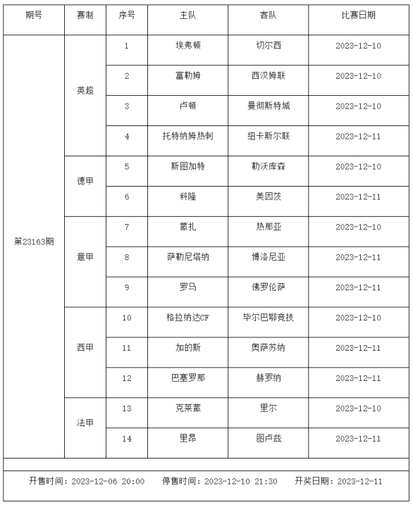 足球彩票勝負(fù)游戲(14場和任選9場)第23163期賽程: