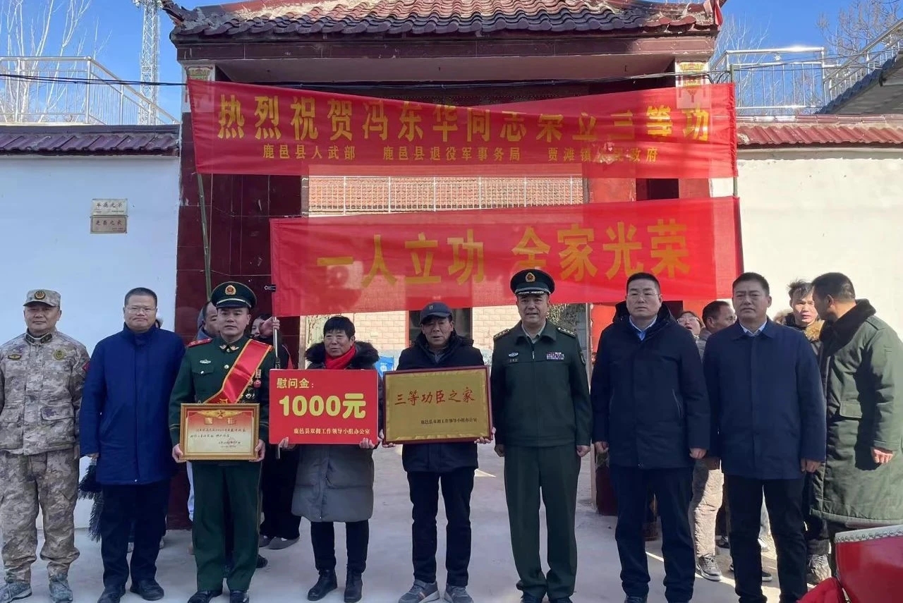 喜報傳佳音,榮耀滿門庭。為進一步弘揚新時代擁軍優(yōu)屬光榮傳統(tǒng),增強軍人榮譽感和軍屬自豪感,1月22日,鹿邑縣人武部領導帶領縣人武部、縣退役軍人事務局及賈灘鎮(zhèn)黨委政府相關負責同志及現(xiàn)役軍人所在部隊代表一行人,敲鑼打鼓來到榮立三等功的現(xiàn)役軍人馮東華同志家中,送上立功喜報和慰問品,向立功軍人及家屬表達親切的關懷和衷心的祝賀。