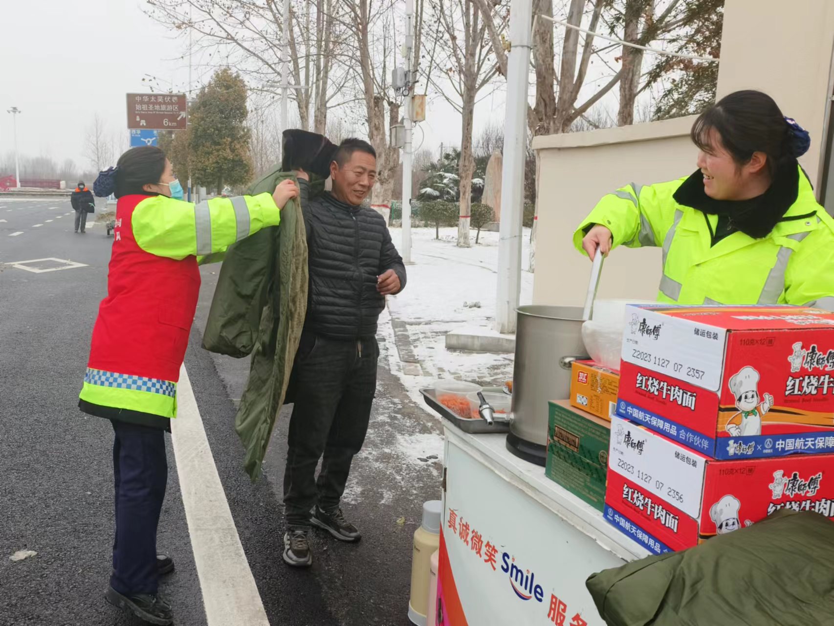 開展“情滿旅途、暖心春運”活動,實行全員駐站,黨員干部下沉一線、靠前指揮;組建黨員突擊隊,設立黨員先鋒崗、志愿服務臺,開展志愿服務,儲備棉大衣2000件、瓶裝水1000件、方便面1200箱、火腿腸500箱、熱水壺500個等應急物資,為司乘提供熱水、維修工具、路況指引、充電器、救助司乘,開辟生命綠色通道,巡邏車開道與時間賽跑,緊急護送危重病人,打通生命救援通道,確保司乘人員“不凍著、不餓著、不滯留”。