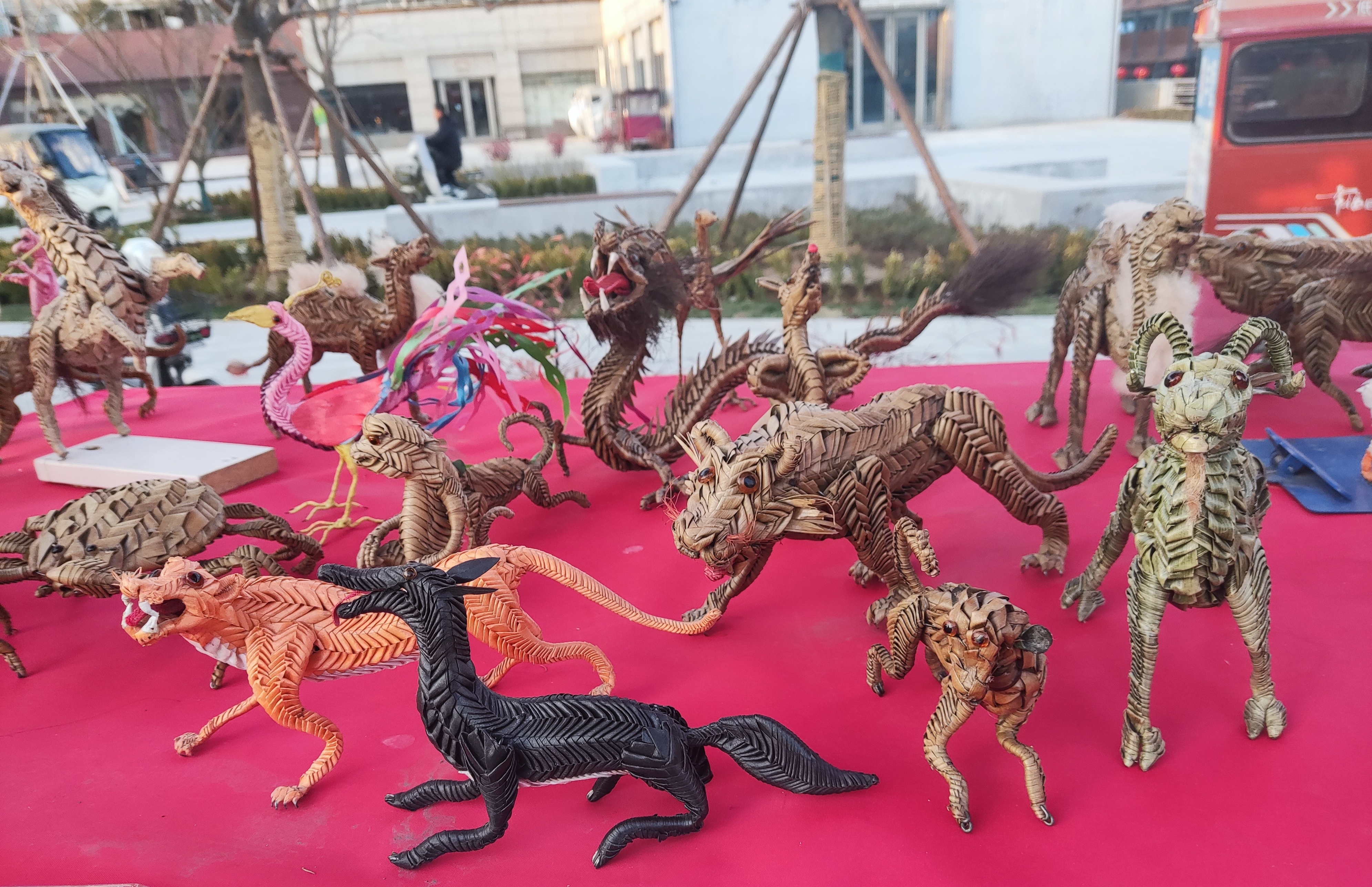 “平時(shí)我會(huì)觀察動(dòng)物的各種神態(tài),慢慢琢磨,根據(jù)編織對(duì)象不同,在編織手法上區(qū)別編織。作品成型后,需要涂抹清漆,既提高了光澤度又能防腐,便于長(zhǎng)久保存和收藏?!敝旌闈弥髌废虼蠹抑v解著。他編織的那條長(zhǎng)龍,活靈活現(xiàn)、神采飛揚(yáng),展現(xiàn)了深厚的文化底蘊(yùn)和編織功底。