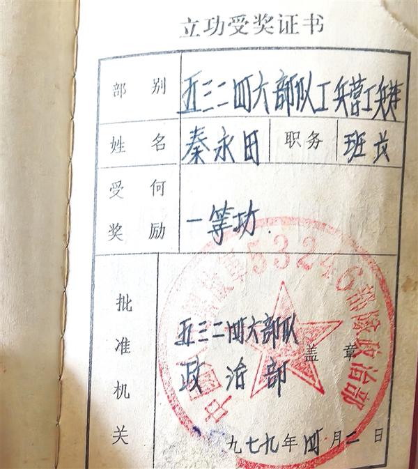 秦永田的立功受獎(jiǎng)證書(shū)。