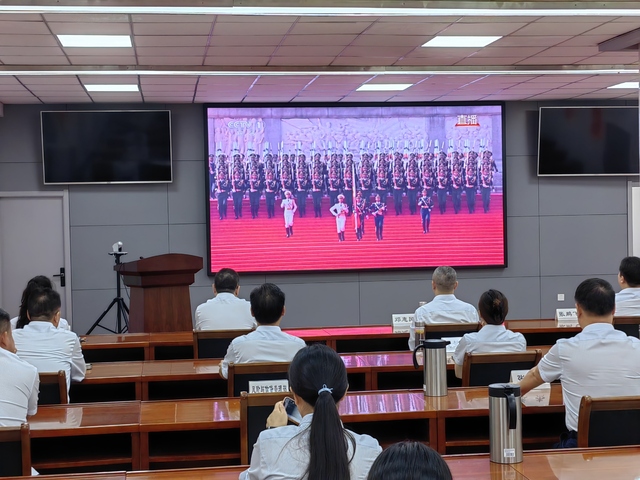 收看過程中,大家心情澎湃,感慨萬千?,F(xiàn)場氣氛莊重而熱烈,大家全神貫注,聆聽習近平總書記重要講話,滿懷激動與自豪的觀看閱兵儀式的全過程。當威武雄壯的三軍儀仗隊邁著鏗鏘有力的步伐率先通過天安門廣場時,當一個個裝備方隊展示著彰顯國家實力的現(xiàn)代化尖端武器時,當戰(zhàn)機梯隊以恢宏陣勢呼嘯掠過蒼穹時,大家內(nèi)心迸發(fā)出由衷的贊嘆,為祖國日益強盛而自豪。