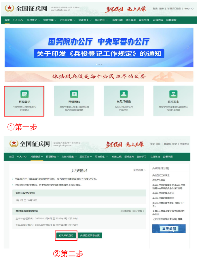 《中華人民共和國兵役法》規(guī)定,“國家實行兵役登記制度。兵役登記包括初次兵役登記和預(yù)備役登記。每年十二月三十一日以前年滿十八周歲的男性公民,都應(yīng)當(dāng)按照兵役機關(guān)的安排在當(dāng)年進行初次兵役登記”。參加兵役登記是法律賦予每個適齡男性公民應(yīng)盡的光榮義務(wù)和神圣責(zé)任,應(yīng)自覺按時進行登記或核對。